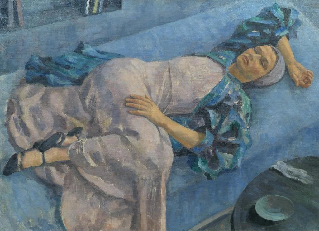 Grete Gamerith sur un Canapé Bleu : un moment de sérénité capturé