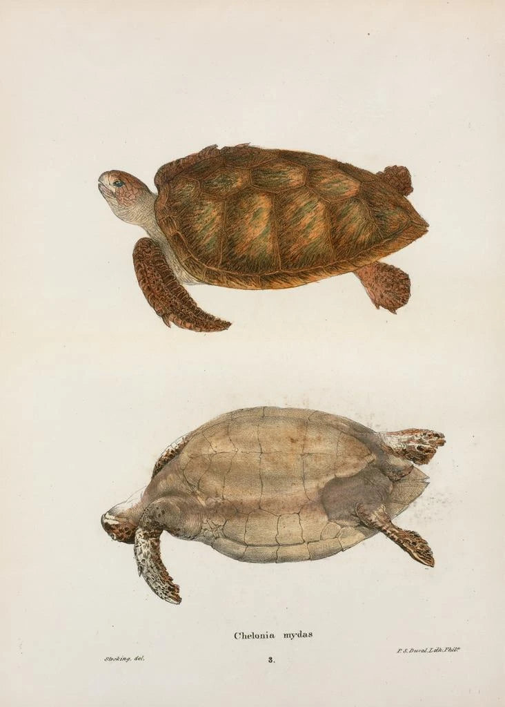 John Edwards Holbrook, naturforsker og illustratør fra det XIX. århundrede, dedikerede sin karriere til studiet og fremstillingen af dyrearter. Påvirket af datidens videnskabelige fremskridt søgte han at forene præcision og æstetik i sine illustrationer. Holbrook fremhævede især krybdyr og skildpadder, hvilket bidrog til viden om disse fascinerende væsner. Hans arbejde med den grønne skildpadde er emblemativt for hans tilgang, der kombinerer videnskabelig stringens med kunstnerisk følsomhed. Gennem sine værker har han formået at øge offentlighedens bevidsthed om dyrelivets rigdom og nødvendigheden af dets bevarelse.