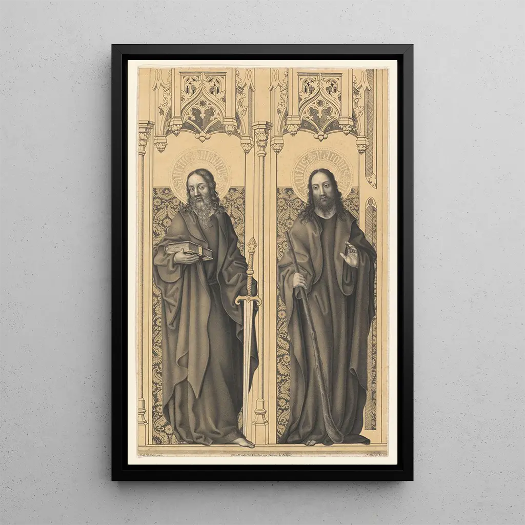 Kunsttrykket af Saints Matthieu og Jacques tager os med ind i en verden, hvor spiritualitet og kunst forenes på en betagende måde. Helgenerne, afbildet med en følelsesmæssig intensitet, er omgivet af et blødt lys, der fremhæver deres fromhedsudtryk. Strixner bruger en palette af varme og rige farver, hvilket skaber en atmosfære, der både er rolig og kraftfuld. De omhyggelige detaljer i klædedragterne og helgenernes attributter tilføjer en taktil dimension til dette værk, hvilket inviterer betragteren til at fordybe sig i deres hellige fortælling.