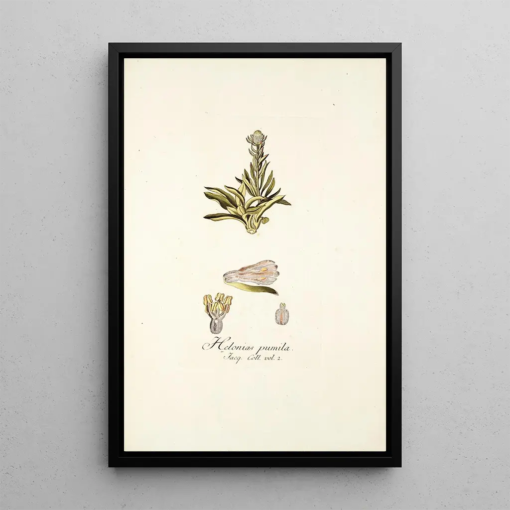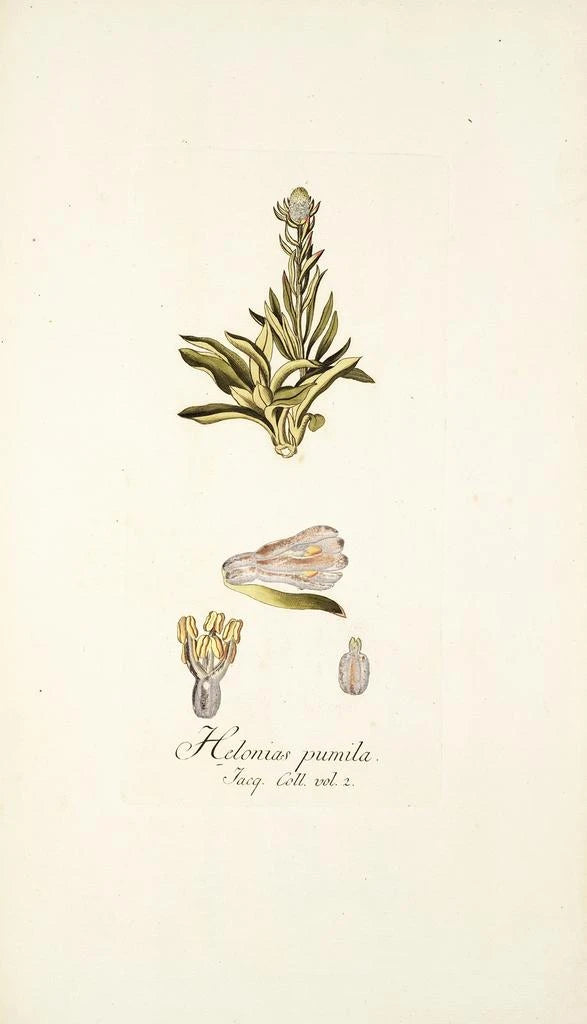 Nikolaus Joseph Freiherr von Jacquin, botaniker og kunstner fra det 18. århundrede, formåede at forene videnskab og kunst i sine værker. Oprindeligt fra Østrig, blev han påvirket af sine rejser og botaniske opdagelser i sin tid, især under sine ekspeditioner i Amerika. Hans illustrationer, som den af Helonias pumila, vidner om hans engagement i at repræsentere floraen med præcision og skønhed. Som medlem af Videnskabsakademiet bidrog Jacquin til fremskridt inden for botanikken, samtidig med at han efterlader et kunstnerisk arv, der fortsat inspirerer kunst- og naturentusiaster.