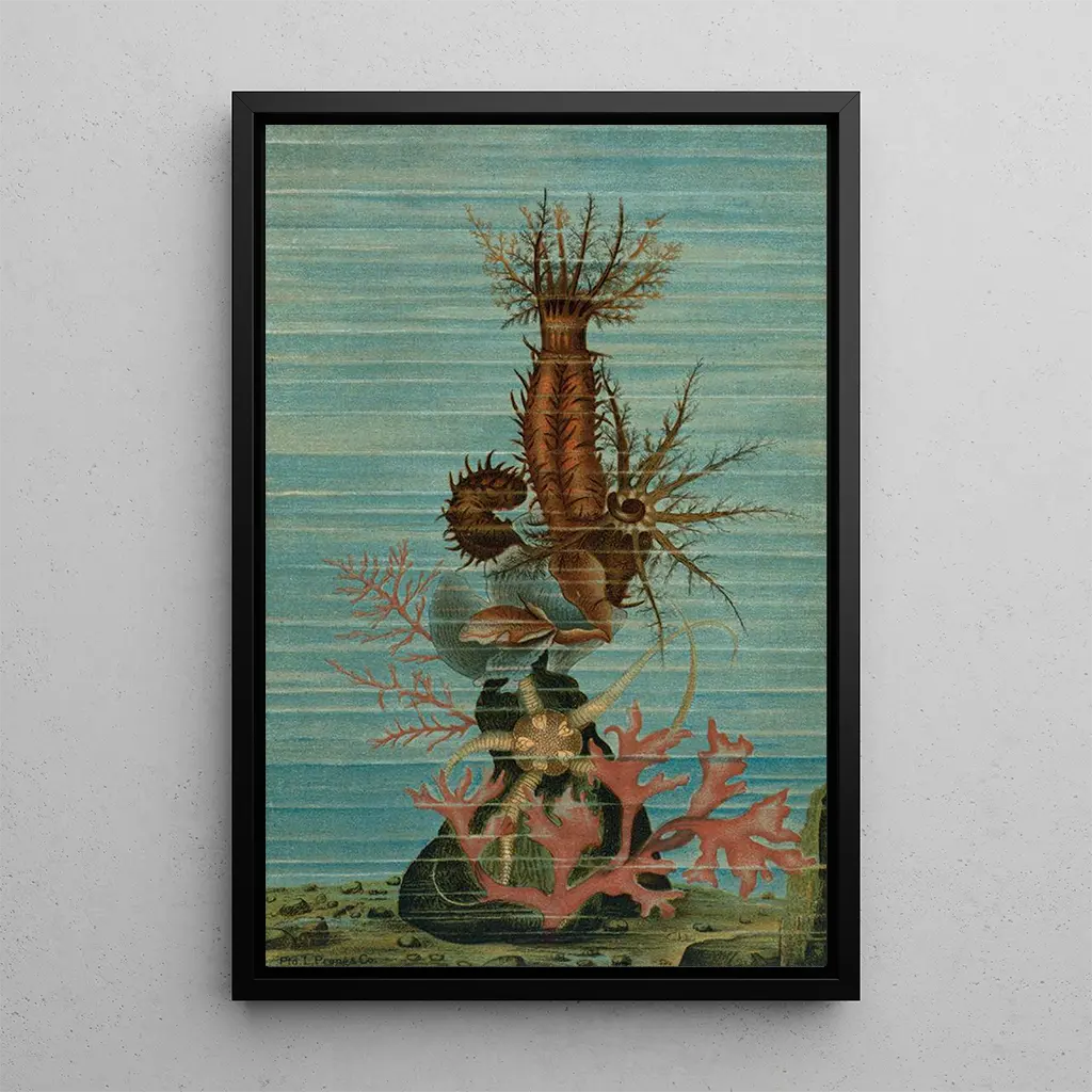 I denne fængslende kunsttryk, Holothuries og søstjerne, dækker John George Wood os med en levende maritim verden. De skinnende farver på holothuries, med nuancer af blå og grøn, står i harmonisk kontrast til den gyldne nuance af søstjernen. Woods teknik, der kombinerer videnskabelig præcision med kunstnerisk følsomhed, skaber en atmosfære, der er både realistisk og poetisk. Hvert detalje, fra teksturerne af havdyrene til lysrefleksionerne, inviterer seeren til at udforske havets dybder og værdsætte skønheden i det marine liv.