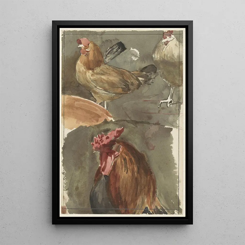 I denne kunsttryk af maleriet Coq med høns fanger Jan Veth essensen af det landlige liv. De varme og jordnære farver, fra dybe brune til strålende gule, skaber en levende og glædelig atmosfære. Kompositionen fremhæver en majestætisk høne, omgivet af høns, hvilket skaber en dynamik af bevægelse og interaktion. Veths teknik, der kombinerer realisme og impressionistiske strejf, giver liv til hver fjer og hvert græsstrå, og transporterer betragteren til et øjeblik af ro og enkelhed.