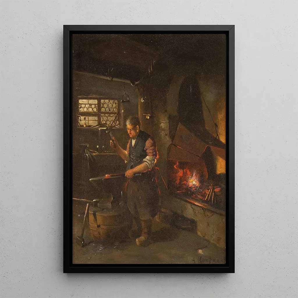 Kunsttrykket af "Hos smeden" er et dekorativt stykke, der vil berige dit hjem, uanset om det er i en stue, et kontor eller et soveværelse. Med sin trofaste trykkvalitet og varme farver tilføjer dette kunsttryk en ægthed og rustik charme til din indretning. Dets æstetiske tiltrækningskraft ligger i evnen til at fremkalde følelser og fortælle en historie, hvilket forvandler ethvert rum til et sted for eftertanke. At vælge dette kunsttryk er at vælge at integrere et værk, der hylder arbejde og tradition, samtidig med at det harmonerer perfekt med forskellige indretningstyper.