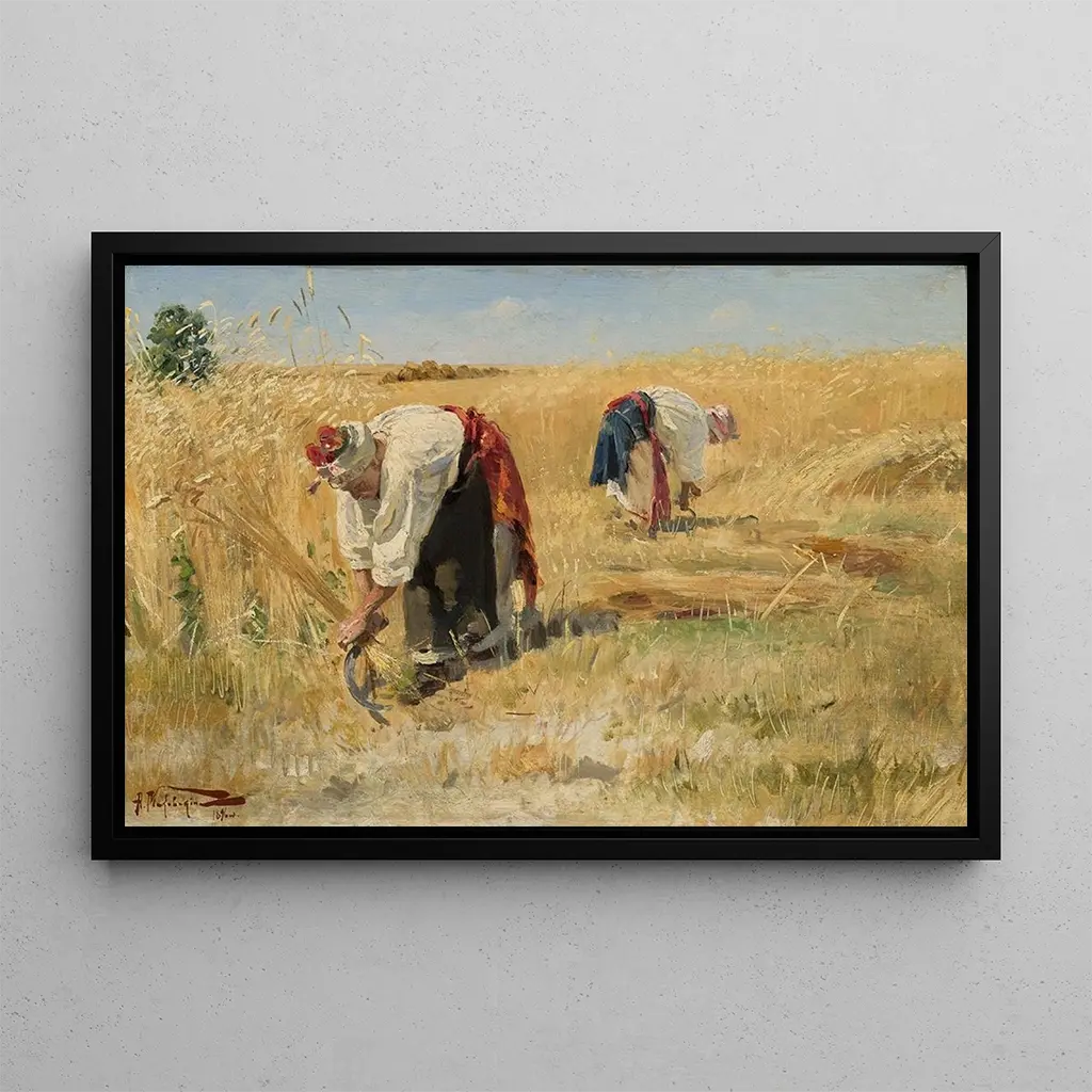Kunstværket "Récolte" af Aleksander W. Makowski tager os med ind i et levende maleri, hvor naturen og den menneskelige indsats flettes sammen. De varme farver, fra gyldne gule til jordbrune nuancer, fremkalder rigdommen af høsten. Makowskis teknik, der blander impressionisme og realisme, skaber en vibrerende og dynamisk atmosfære, hvor hvert penselstrøg synes at fange bevægelsen af de arbejdende figurer. Silhuetterne af landmændene, næsten i harmoni med landskabet, vidner om en dyb forbindelse til jorden og inviterer betragteren til at føle glæden og tilfredsheden ved høsten.