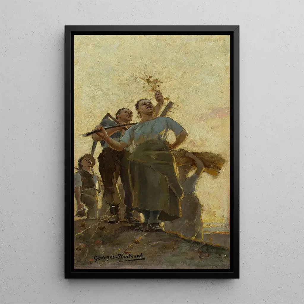 Kunsttrykket af La moisson af Georges Bertrand fremkalder skønheden i landbrugsarbejde og rigdommen i landlige landskaber. Dette værk skildrer bønder i fuld aktivitet, der høster frugterne af deres anstrengelser under en lysende himmel. De livlige farver, der blander gyldne gule og dybe grønne nuancer, skaber en glædelig og dynamisk atmosfære. Bertrand's teknik, der kombinerer impressionisme og realisme, gør det muligt at føle solens varme og arbejdernes indsats. Hvert penselstrøg synes at fange selve essensen af naturen, og hylder enkelheden og skønheden i livet på landet.