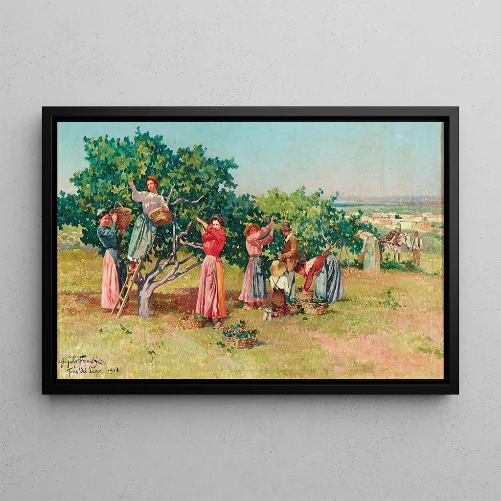 Reproduktion i Toscana: en hyldest til jorden og dens frugter "Reproduktion i Toscana" er et livligt værk af Angiolo Tommasi, der fejrer skønheden i de italienske landbrugslandskaber. Lærredet skildrer bønder i arbejde, omgivet af gyldne marker og grønne bakker under en lysende himmel. De varme og jordnære farver, kombineret med en impressionistisk teknik, skaber en levende og dynamisk atmosfære. Tommasi formår at fange essensen af det landlige liv, hvilket vækker en følelse af taknemmelighed over for jorden og dens høst. Dette maleri er en invitation til at værdsætte menneskets arbejde og de toscanske landskabers rigdom. Angiolo Tommasi: en repræsentant for den post-impressionistiske bevægelse Angiolo Tommasi, en italiensk kunstner fra begyndelsen af det 20. århundrede, er ofte forbundet med den post-impressionistiske bevægelse. Uddannet ved Florens Kunstakademi, blev han påvirket af tidens store mestre, samtidig med at han udviklede en personlig stil, der kombinerer realisme og impressionisme. Tommasi har viet en stor del af sin karriere til at skildre det landlige liv og Toscanske landskaber, hvilket vidner om en tid, hvor kunsten afspejlede traditioner og livsstil. Hans kunstværk "Reproduktion i Toscana" er emblemativ for denne søgen efter skønhed og sandhed. En dekorativ erhvervelse med mange fordele Reproduktionen af "Reproduktion i Toscana" er et ideelt dekorativt valg til at berige dit hjem, uanset om det er i en stue, spisestue eller et kontor. Dens reproduktionskvalitet sikrer en trofast gengivelse af nuancer og detaljer i det originale værk, hvilket giver mulighed for at nyde Tommasis æstetik fuldt ud. Med sin rustikke charme og livlige skildring af naturen bringer dette lærred en varm og indbydende atmosfære, samtidig med at det fejrer harmonien mellem mennesket og dets omgivelser.