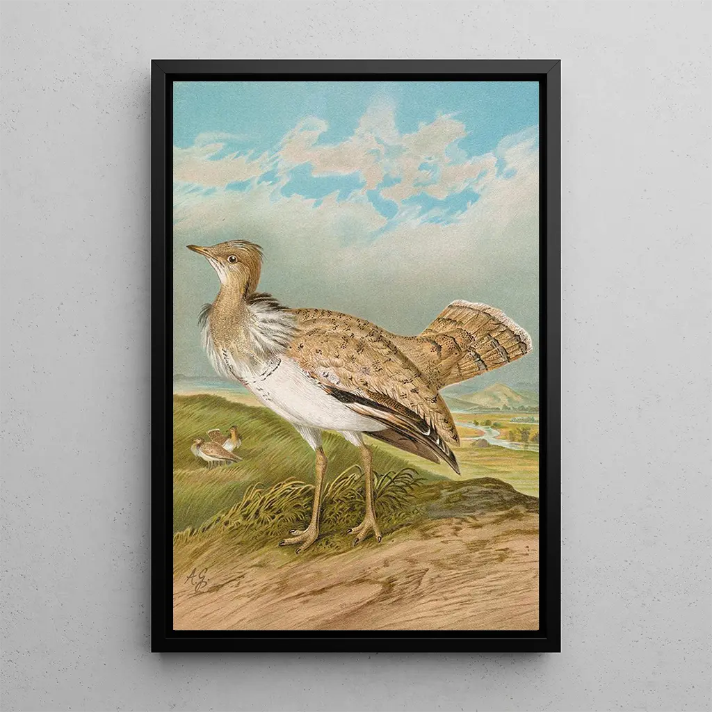 Den kunsttryk Houbara Macqueeni Gray, udført af Johann Friedrich Naumann, fremhæver den vilde skønhed og dyrenes delikatesse. Dette maleri, rigt på detaljer, fremviser nuancerne i fuglens fjerdragt, der skifter mellem jordfarvede nuancer og lyse glimt. Den akvarelteknik, der er anvendt med finesse, giver værket en livlig og vibrerende atmosfære, næsten håndgribelig. De fine træk af Houbara, fanget med præcision, inviterer betragteren til at dykke ned i en naturlig verden, hvor hver fjer synes at fortælle en historie.