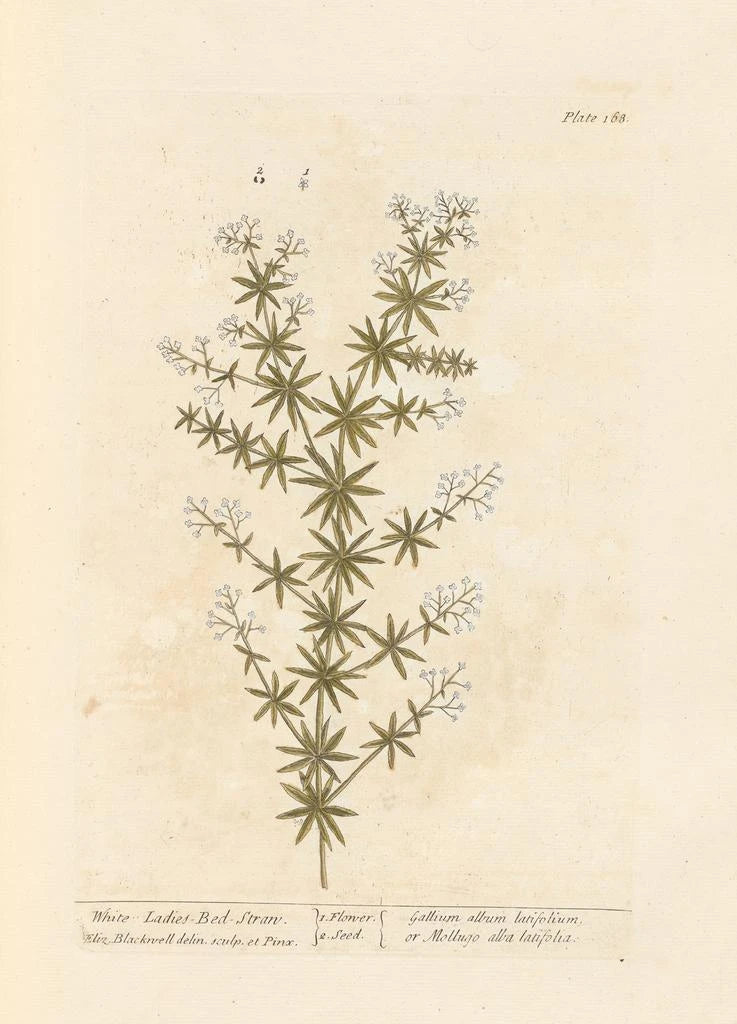 Le tableau "Caille-lait blanc" af Elizabeth Blackwell er en udsøgt fremstilling af denne delikate, ofte ukendte plante. Nuancerne af grønt og hvidt blander sig harmonisk, hvilket skaber en blid og fredelig atmosfære. Detaljernes præcision, typisk for Elizabeth Blackwells stil, gør det muligt at værdsætte hver enkelt blomst og blad med en bemærkelsesværdig klarhed. Dette værk inviterer til en opmærksom betragning, der afslører den subtile skønhed i floraen og dens medicinske egenskaber.