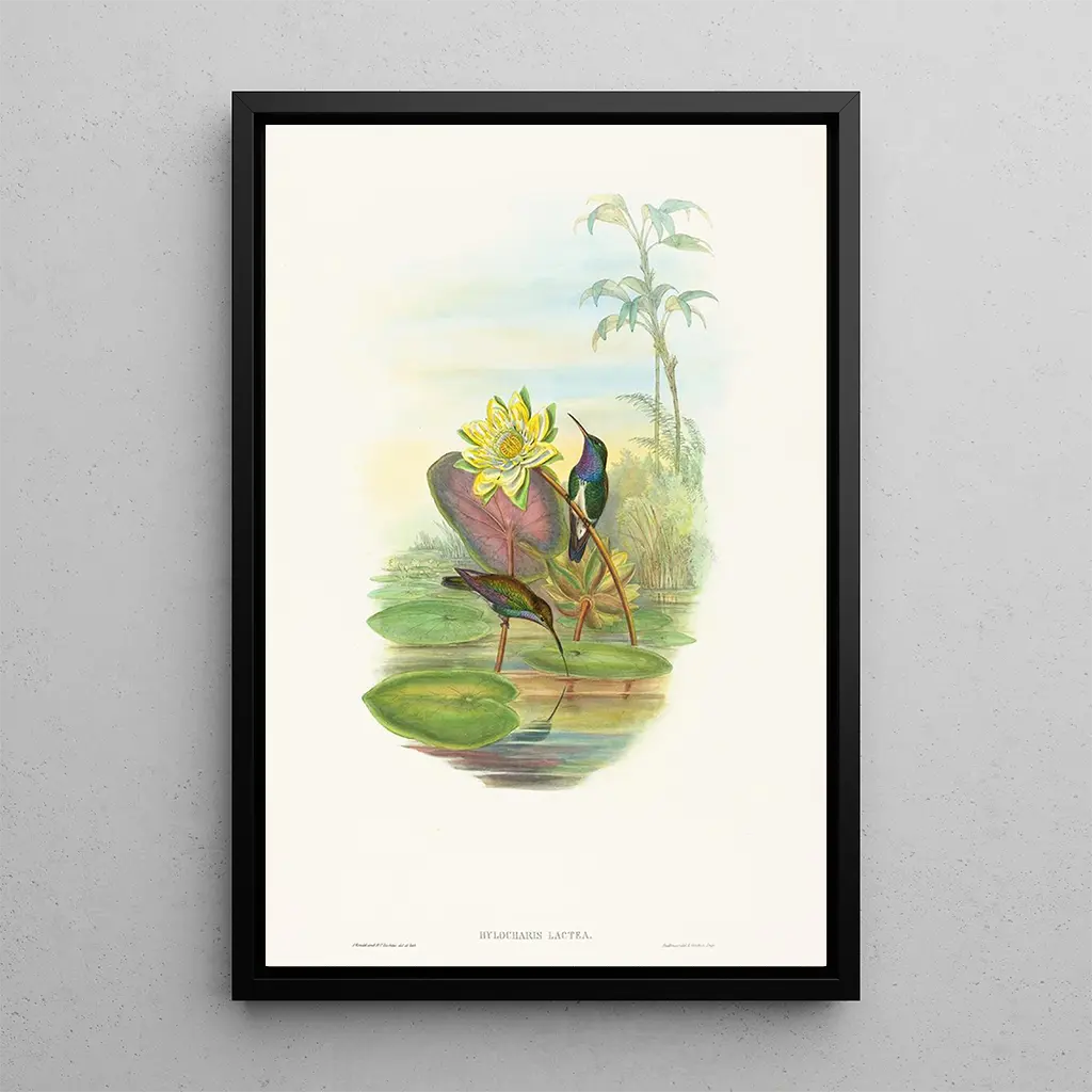 John Gould, britisk naturalist og illustratør fra det 19. århundrede, er anerkendt som en af de største ornitologer i sin tid. Hans passion for fugle førte ham rundt i verden, hvor han samlede eksemplarer og lavede illustrationer med bemærkelsesværdig præcision. Påvirket af tidens videnskabelige opdagelser, formåede Gould at forene kunst og videnskab, og hylde fuglenes mangfoldighed. Hans værker, herunder kunsttrykket Hylocharis lactea, er blevet referencer inden for ornitologi og vidner om hans engagement i at dokumentere naturens skønhed.