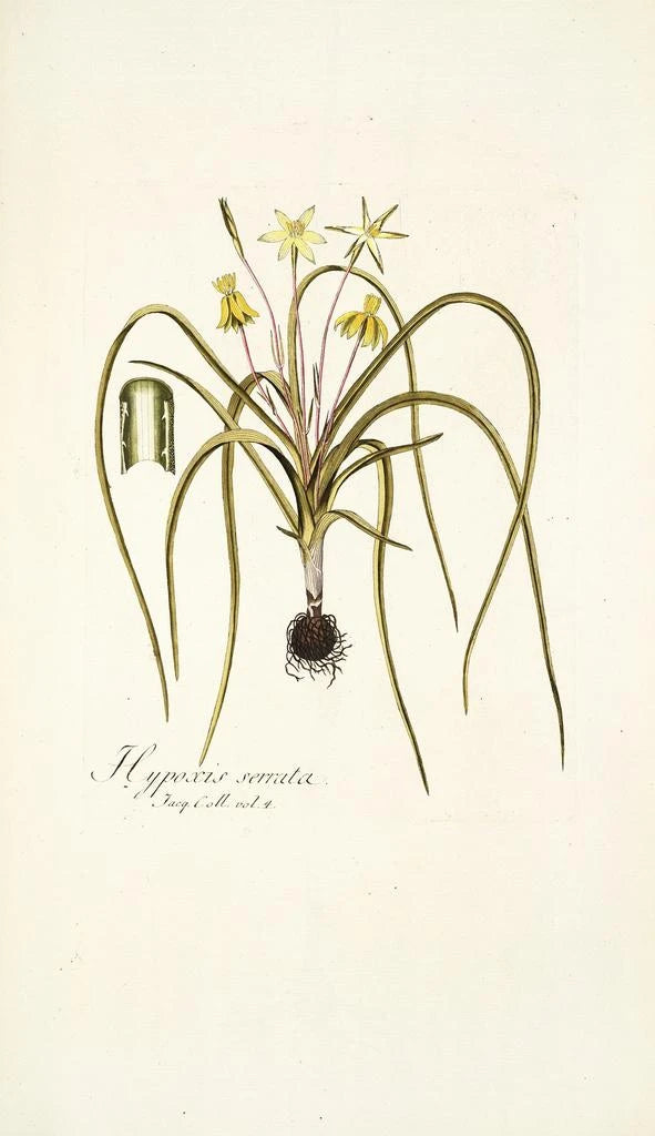 Nikolaus Joseph Freiherr von Jacquin, botaniker og kunstner fra det 18. århundrede, formåede at forene videnskab og kunst i sine værker. Oprindeligt fra Østrig, blev han påvirket af de opdagelsesrejser, der prægede hans tid, især til Caribien og Sydamerika. Hans botaniske illustrationer, som "Hypoxis serrata", vidner om hans omhu med detaljerne og hans passion for naturen. Som medlem af Videnskabsakademiet bidrog Jacquin til fremskridt inden for botanisk viden, samtidig med at han efterlader en tydelig kunstnerisk arv. Hans værker betragtes i dag som referencer inden for videnskabelig illustration.