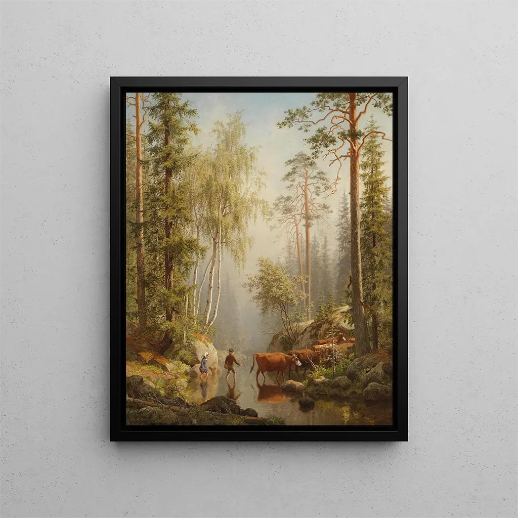 Kunsttryk I Woodland-floden - Carl Bøgh – Fangende introduktion I det rige og varierede kunsthistoriske univers formår nogle værker at fange selve essensen af naturen med en sådan intensitet, at de synes at transcendere tiden. "I Woodland-floden - Carl Bøgh" er en af disse mesterlige kreationer, der inviterer seeren til at dykke ned i en verden, hvor ro og vild skønhed sameksisterer i harmoni. Dette værk, fyldt med poesi, vækker minder om barndom, fredelige gåture langs floder og magien i frodige skove. Gennem en subtil leg med lys og farve formår Bøgh at gøre det bløde i et frossent øjeblik håndgribeligt, hvor hver detalje, fra bladens raslen til vandets hvisken, synes at få liv. Værkets stil og særpræg Carl Bøghs stil karakteriseres ved en impressionistisk tilgang, hvor lyset spiller en central rolle i kompositionen. I "I Woodland-floden" bruger maleren delikate farvetouch til at skildre den omkringliggende vegetation og de glitrende reflekser på vandoverfladen. Denne stilistiske valg giver værket en næsten æterisk atmosfære, hvor seeren kan føle friskheden af luften og jordens fugtighed. Bøghs teknik, der smidigt kombinerer præcision og frihed, skaber en fornemmelse af bevægelse og liv, som om lærredet er et øjebliksbillede af en scene i konstant udvikling. Farvepaletten, domineret af dybe grønne og beroligende blå nuancer, fremkalder en naturlig harmoni, mens de minutøse detaljer i blade og grene tilføjer en taktil dimension til værket. Kunstneren og hans indflydelse Carl Bøgh, dansk maler fra det 19. århundrede, er ofte forbundet med romantikkens bevægelse, der hylder udtrykket for følelser og naturens fejring. Hans fascination af skandinaviske landskaber og hans ønske om at fange skønheden i naturlige omgivelser har præget hans kunstneriske rejse. Bøgh har formået at hente inspiration fra tidens mestre, samtidig med at han har udviklet en unik stemme, hvilket gør ham til en pioner inden for skildringen af nordiske landskaber. Hans værker, som "I Woodland-floden", vidner om en