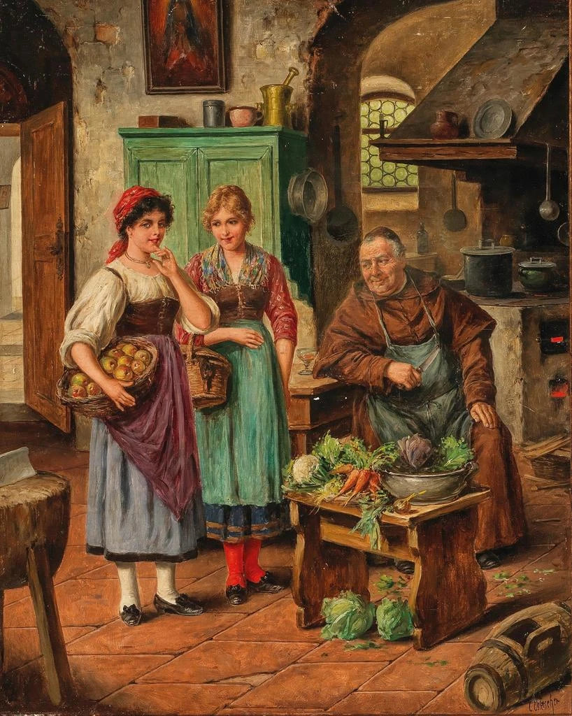 I en verden, hvor kunst dialogerer med dagliglivet, står værket "I Køkkenet på klosteret" af Carl Ostersetzer som et levende vidnesbyrd om enkelhed og ægthed. Dette maleri, præget af menneskelig varme og ro, tager os med til hjertet af det klosterrige liv, et univers hvor hverdag møder spiritualitet. Gennem denne intime scene inviterer Ostersetzer os til at opdage et øjeblik af eftertanke og fællesskab, hvor hver detalje synes at fortælle en historie. Det bløde lys, der bader rummet, de delikate gestus fra personerne og hverdagens genstande kombineres for at skabe en næsten håndgribelig atmosfære, der transporterer os til et både fjernt og velkendt tidsrum.