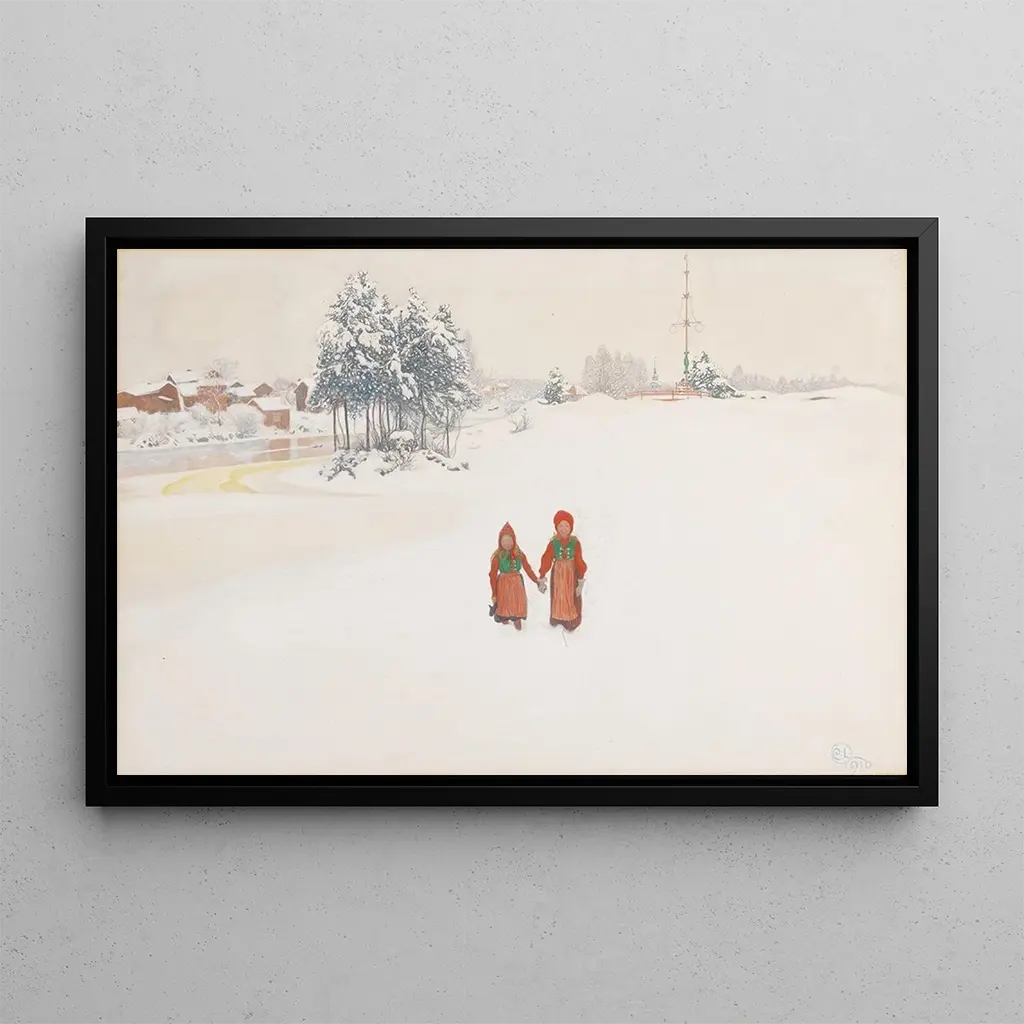Den kunsttryk af I denne sne tager os med til et fortryllende vintersceneri, hvor sneen forsigtigt dækker jorden og træerne. De bløde nuancer af hvid og blå skaber en fredelig atmosfære, mens personerne, klædt varmt på, fremkalder en følelse af menneskelig varme midt i kulden. Carl Larssons teknik, der kombinerer akvarel og tegning, giver liv til denne scene, og fanger uskylden og glæden ved børn, der leger i sneen. Hvert penselstrøg synes at fortælle en historie, og inviterer til drømmende refleksion og eftertanke.