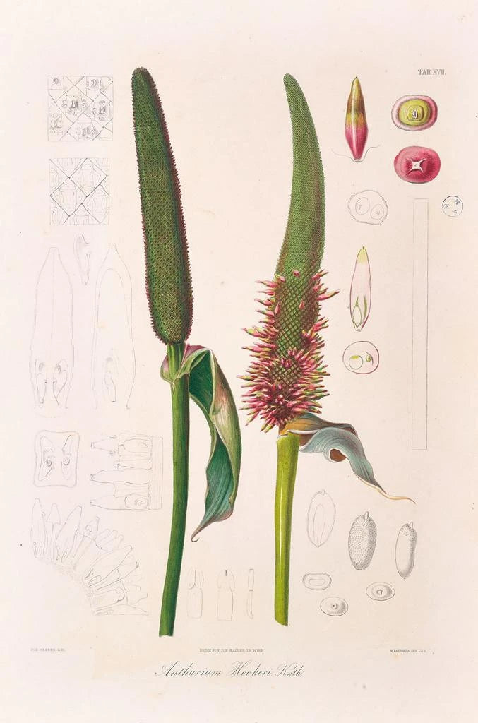 "Icones Aroidearum Pl17" af Heinrich Wilhelm Schott er et kunsttryk, der fejrer rigdommen og mangfoldigheden af Aroid-planter. Med sine detaljerede illustrationer og livlige farver transporterer dette botaniske kunsttryk betragteren til en frodig verden. Nuancer af grøn, rosa og hvid blandes harmonisk, hvilket skaber en atmosfære, der både er beroligende og forfriskende. Akvarelteknikken, kombineret med en præcis streg, hylder den den naturlige skønhed af planterne og giver samtidig en kunstnerisk fortolkning af den tropiske flora.