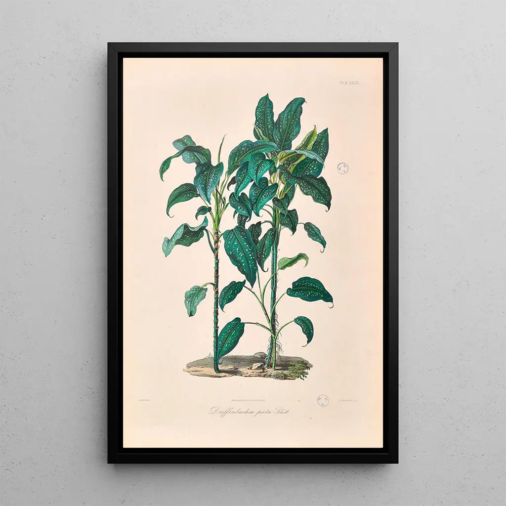 "Icones Aroidearum Pl24" af Heinrich Wilhelm Schott er et fascinerende kunsttryk, der fremhæver mangfoldigheden af aroidplanter. Denne botaniske illustration, rig på detaljer, indfanger essensen af disse eksotiske arter og afslører former og farver, der forbløffer. De livlige nuancer af grøn, rosa og hvid blandes harmonisk og skaber en atmosfære, der både er beroligende og stimulerende. Graveringsteknikken, præcis og delikat, giver mulighed for at gengive teksturen af blade og blomster, hvilket inviterer betragteren til at udforske hvert element i denne komposition. Det er en sand hyldest til naturen, der transporterer observatøren til en frodig verden.