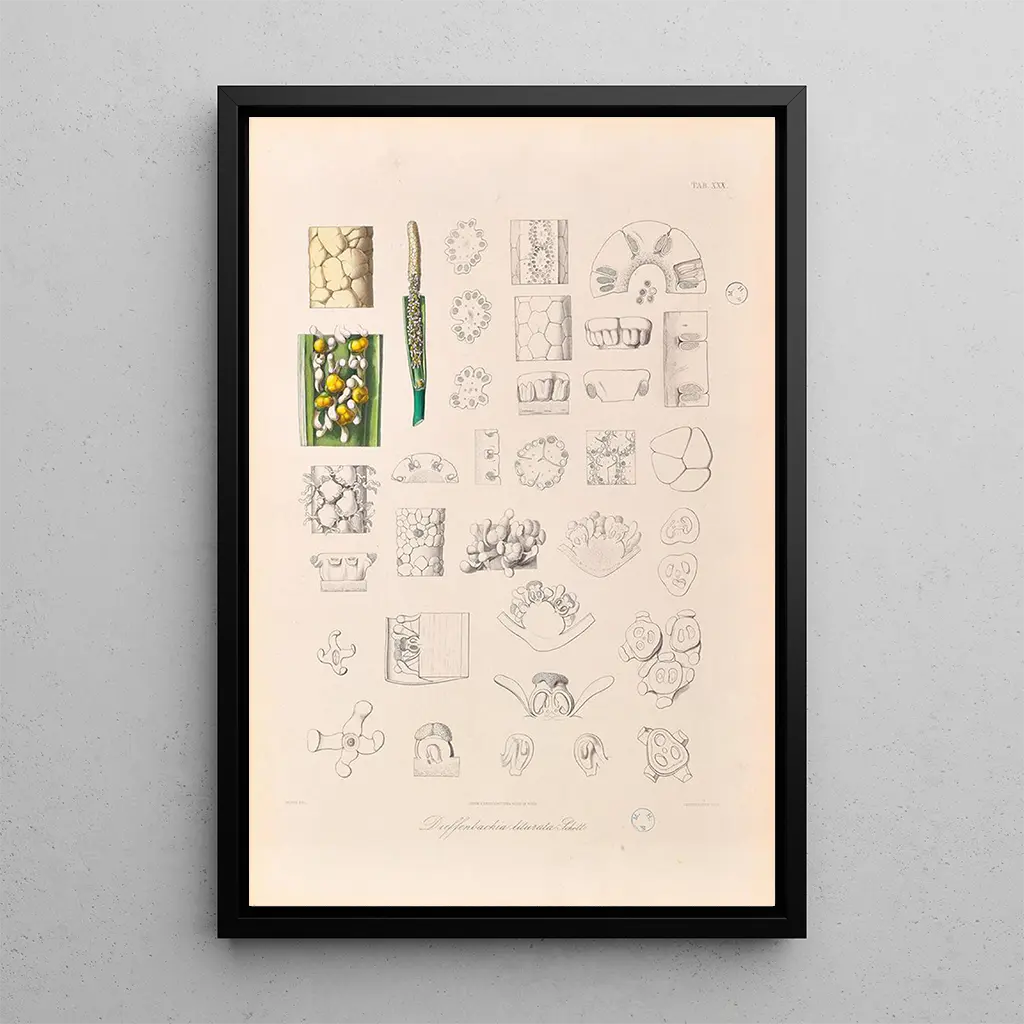 "Icones Aroidearum Pl30" af Heinrich Wilhelm Schott er et værk, der transporterer betragteren til en frodig verden af former og farver. Denne botaniske illustration fremhæver de karakteristiske træk ved arumplanterne med detaljer, der afslører hver plantes kompleksitet. De rige og varierede nuancer, fra dyb grøn til strålende hvid og violet, skaber en levende og dynamisk atmosfære. Graveringsteknikken, kombineret med en skarp observationssans, gør det muligt for Schott at fange essensen af disse fascinerende planter og inviterer til at udforske naturens skønhed.