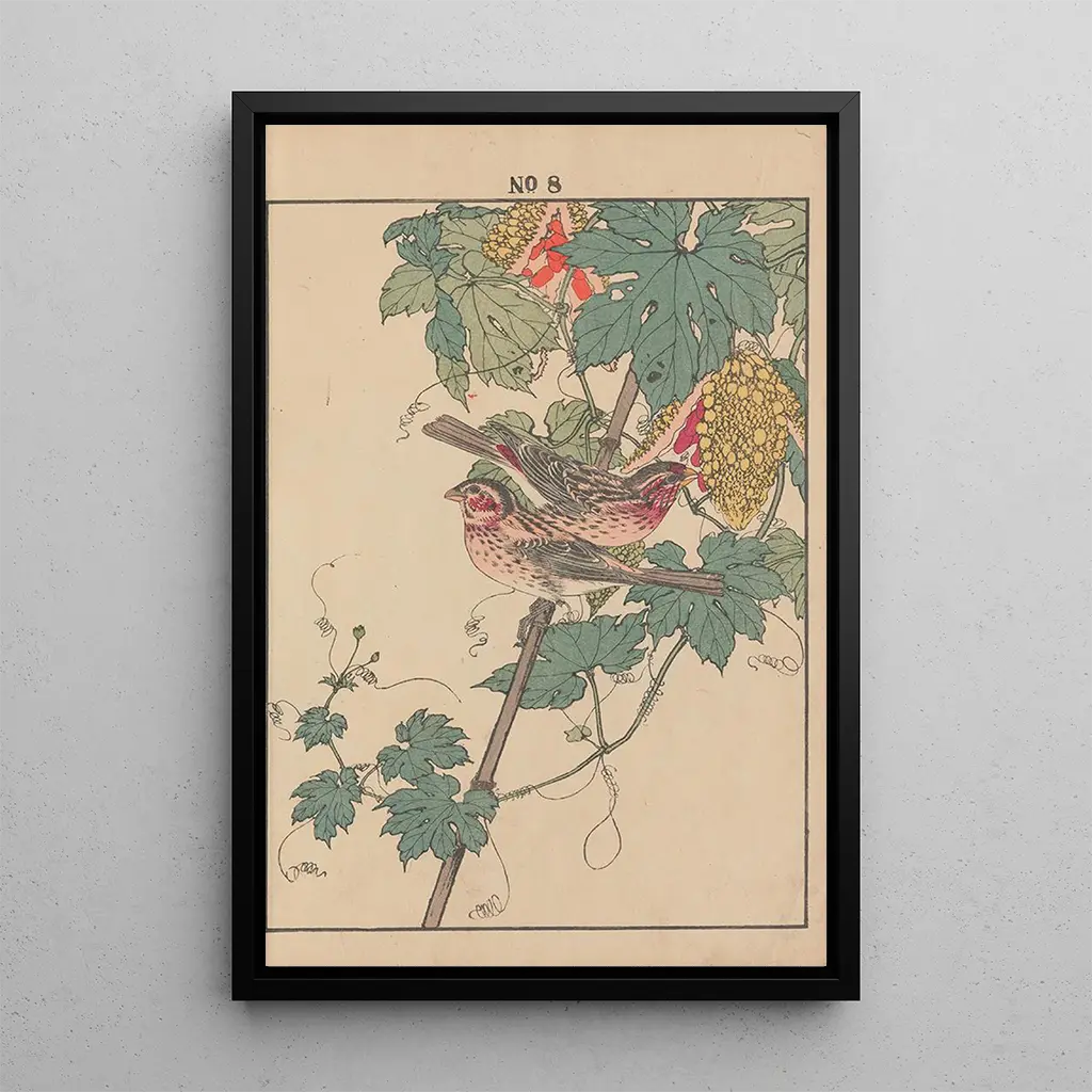 I denne kunsttryk af Keinen kach gafu Pl010 dykker kunstneren Imao Keinen ned i en delikat verden, hvor naturen blomstrer med ynde. Pastelfarver, bløde og beroligende, blander sig harmonisk for at skabe en fredelig atmosfære. Teknikken med ukiyo-e, typisk for japansk kunst, gør det muligt at fange detaljernes finesse, fra delikate blomster til frodige blade. Hvert element synes levende og inviterer betragteren til at fordybe sig i denne idylliske scene, som en let brise, der kærtegner kronbladene.