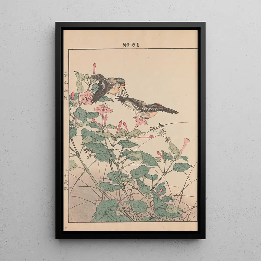 Kunsttrykket Keinen kach gafu Pl023 af Imao Keinen er en smuk illustration af blomsterfinhed. Dette værk, præget af poesi, fanger essensen af naturen gennem livlige farver og raffinerede mønstre. Blomsterne, gengivet med omhu, virker næsten levende og fremkalder en følelse af lethed og ynde. Teknikken med tryk, karakteristisk for ukiyo-e, giver dette lærred dybde og tekstur, der inviterer til forundring. Dykket ned i denne blomsterlige scene, føler man en dyb forbindelse til den naturlige verden.