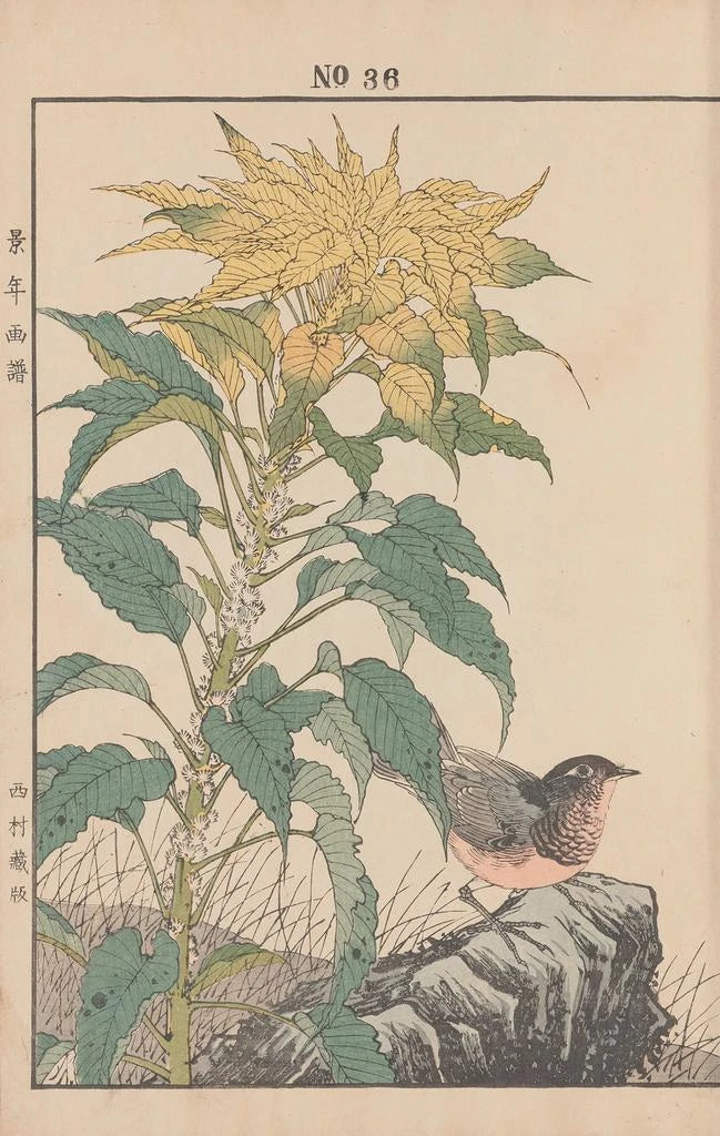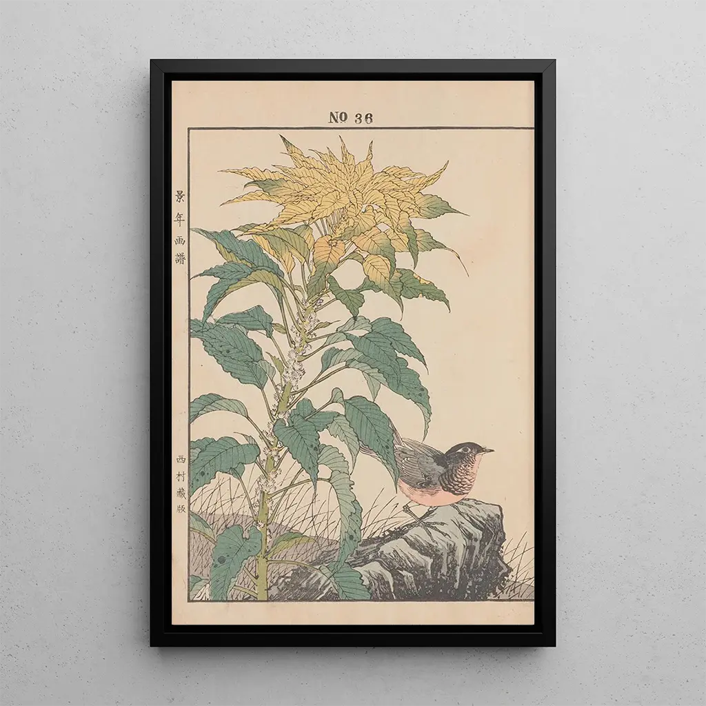 Kunsttrykket af Keinen kach gafu Pl039 tager os med ind i en verden, hvor naturen bliver fremhævet med en enestående finesse. De bløde farver og de omhyggelige detaljer i blomster og fugle skaber en beroligende, næsten meditativ atmosfære. Teknikken med ukiyo-e på papir, typisk for Edo-perioden, giver kunstneren mulighed for at fange den flygtige skønhed i japansk flora og fauna. Hvert element synes at vibrere under betragterens blik, hvilket inviterer til en stilfærdig og respektfuld betragning af naturen.