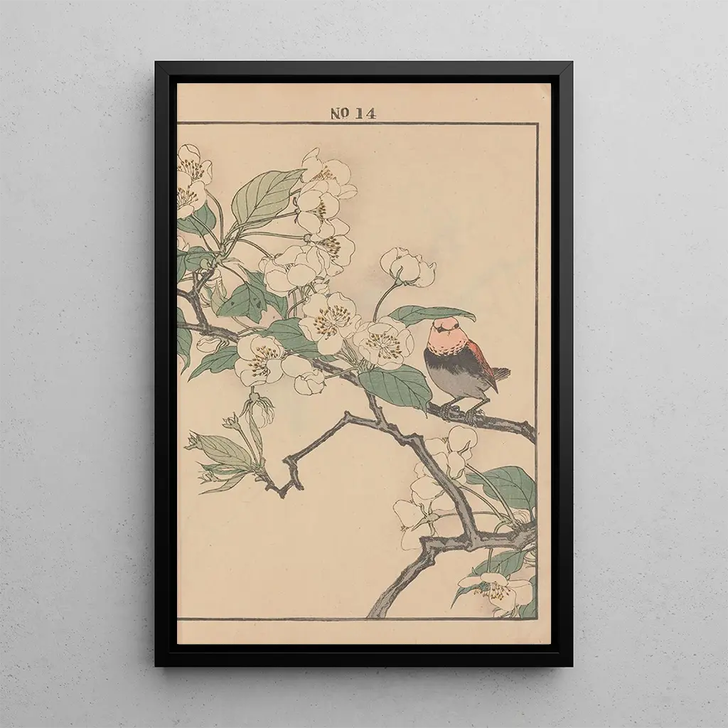 Keinen kach gafu Pl060 er et kunsttryk, der fejrer skønheden i naturen gennem detaljerede elementer og en palette af delikate farver. Hvert element, fra blomster til fugle, er gengivet med en præcision, der inviterer til forundring. Teknikken med træsnit på papir, typisk for Edo-perioden, giver dette kunsttryk en beroligende og kontemplativ atmosfære. Nuancerne af grønt og rosa flettes harmonisk sammen og skaber et levende billede, der næsten synes at ånde. Dette kunsttryk er en sand hyldest til roen og harmonien, man finder i naturen.