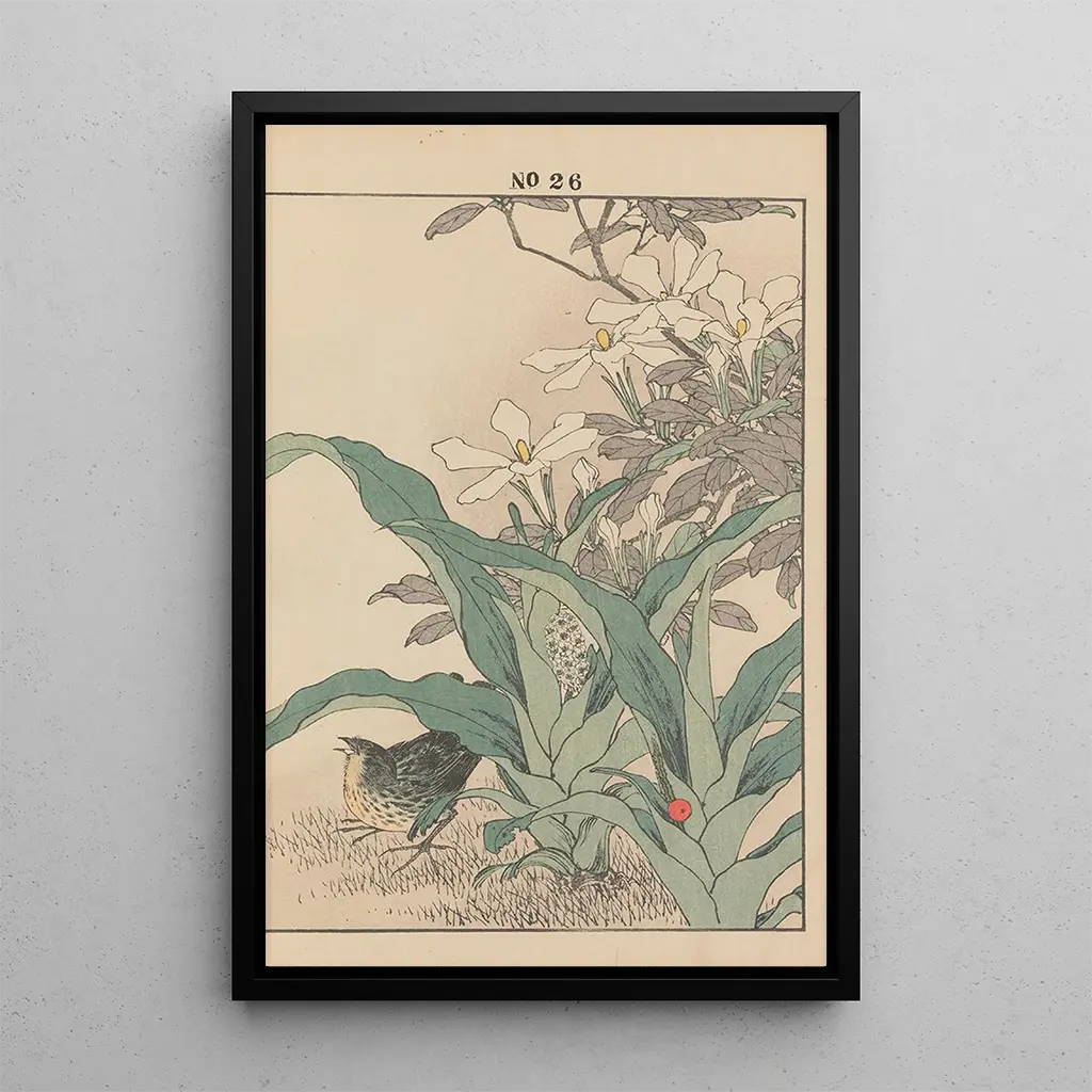 I denne kunsttryk af Keinen kach gafu Pl116, tager kunstneren Imao Keinen os med på en rejse ind i en verden, hvor naturen blomstrer med uendelig ynde. De livlige farver, der spænder fra frodige grønne nuancer til delikate rosa, skaber en rolig og beroligende atmosfære. Teknikken med træsnit på papir, typisk for Edo-perioden, gør det muligt at fange de subtile nuancer i hver blomst og blad. Hvert eneste detalje er omhyggeligt gengivet, hvilket inviterer betragteren til en dyb refleksion over naturens flygtige skønhed. Dette kunstværk fremkalder en perfekt harmoni mellem mennesket og dets omgivelser, en opfordring til at sænke tempoet og værdsætte den verden, der omgiver os.