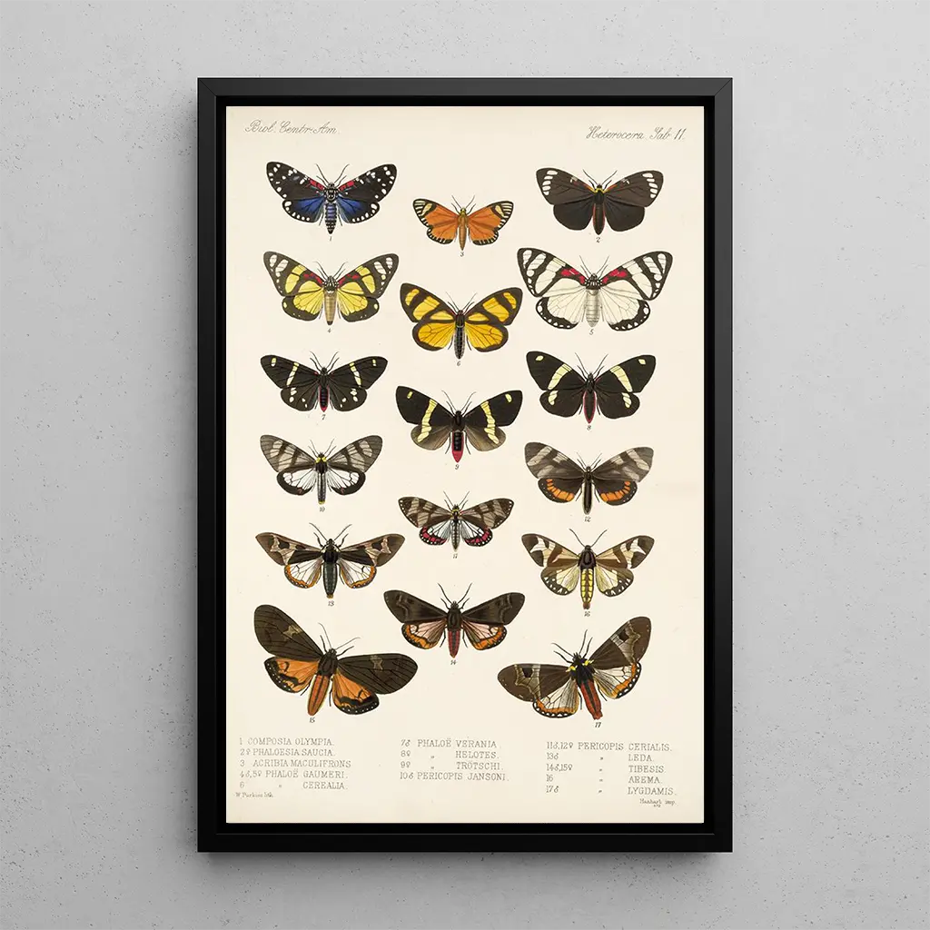 "Insecta Lepidoptera Heterocera Pl 011" af Frederick DuCane Godman er et kunsttryk, der fremhæver skønheden af nattefugle. Med en omhyggelig opmærksomhed på detaljer afslører denne illustration mønstre og farver, der fanger øjet. De mørke og lyse nuancer blandes harmonisk, hvilket skaber en atmosfære, der er både mystisk og fortryllende. Godmans teknik, der kombinerer akvarel og tegning, giver mulighed for at hylde disse fascinerende væsener, samtidig med at den tilbyder en kunstnerisk vision af deres naturlige skønhed.