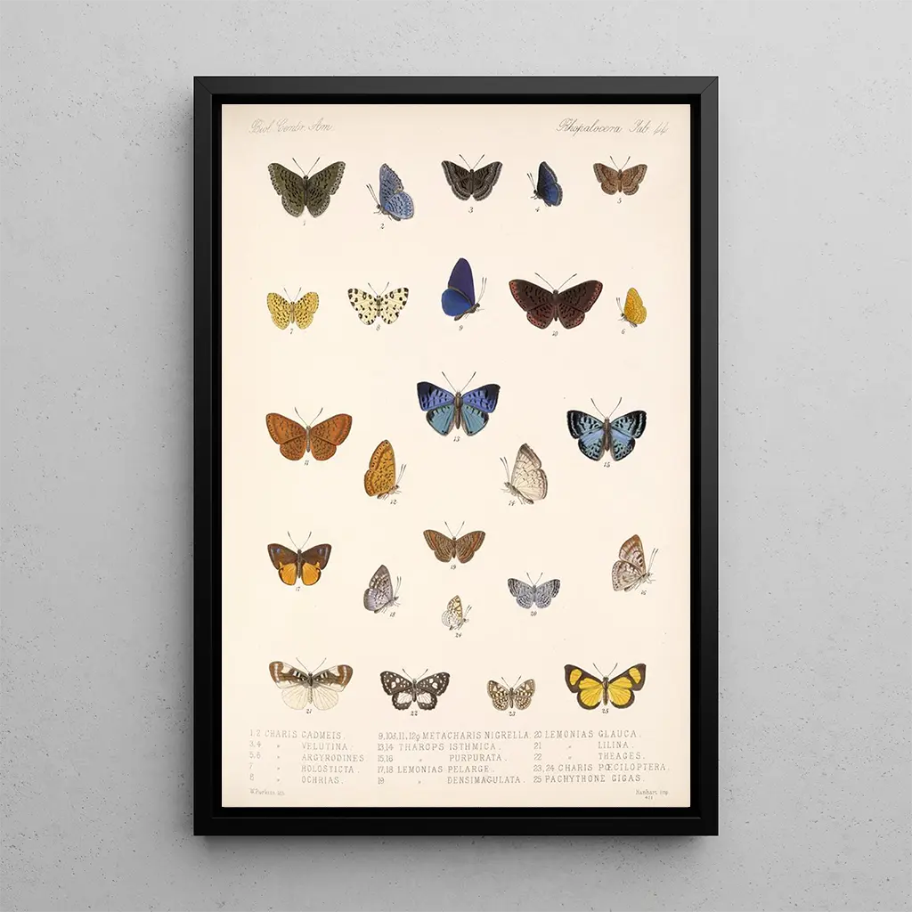 Den kunsttryk Insecta Lepidoptera Rhopalocera Pl 045 tilbyder en fængslende dykning ned i den farverige univers af sommerfugle. Med livlige nuancer og omhyggelige detaljer fremhæver dette værk den delikate skønhed af disse insekter. Nuancerne af blå, gul og sort blander sig harmonisk, hvilket skaber en atmosfære, der er både livlig og beroligende. Den naturalistiske illustrations teknik, der er karakteristisk for perioden, gør det muligt at fange essensen af disse flygtige skabninger og inviterer betragteren til at beundre biodiversitetens rigdom.
