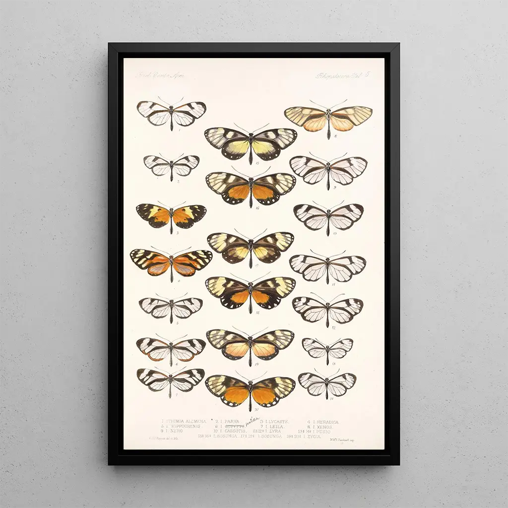 Værket "Insecta Lepidoptera Rhopalocera Pl 005" af Frederick DuCane Godman er en visuel fejring af den fascinerende mangfoldighed af sommerfugle. Dette kunsttryk er kendetegnet ved sine livlige farver og harmoniske sammensætning, der fremhæver den naturlige skønhed af disse insekter. Hvert detalje er omhyggeligt gengivet, fra de komplekse mønstre på vingerne til de subtile nuancer i farverne. Atmosfæren, der udspringer af dette værk, er både videnskabelig og kunstnerisk, hvilket inviterer til at udforske verdenen af Lepidoptera med forundring og nysgerrighed.