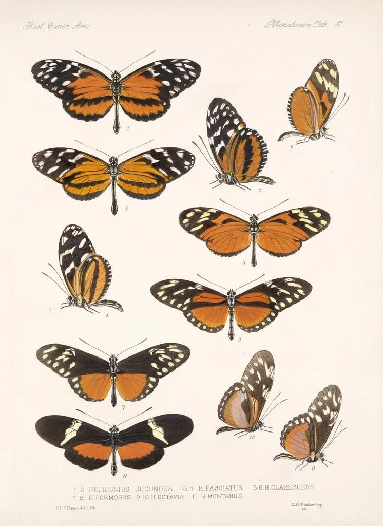 Denne kunsttryk af maleriet Insecta Lepidoptera Rhopalocera Pl 017 af Frederick DuCane Godman dykker ned i en delikat og farverig verden, hvor de levende nuancer på sommerfuglenes vinger flettes sammen. Den omhyggelige komposition fremhæver en række arter, hver fanget med bemærkelsesværdig videnskabelig præcision. Pastelfarver blander sig med mere livlige glimt, hvilket skaber en atmosfære, der både er beroligende og fængslende. Godman, som naturforsker, formår at forene kunst og videnskab og tilbyder en poetisk vision af biodiversiteten.