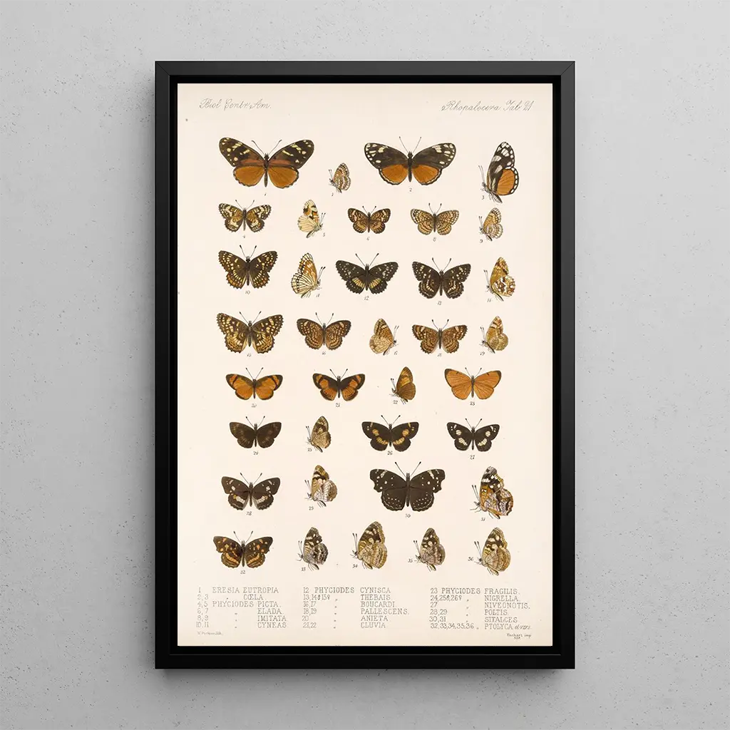Kunsttrykket Insecta Lepidoptera Rhopalocera Pl 021 skiller sig ud med sin slående fremstilling af mangfoldigheden af sommerfugle. Hvert eksemplar er illustreret med bemærkelsesværdig omhu, hvilket fremhæver nuancerne i farver og de unikke mønstre, der kendetegner disse fascinerende insekter. De skinnende nuancer, der spænder fra livlige orange til subtile grønne, skaber en fængslende visuel harmoni. Atmosfæren, der udspringer af dette lærred, er både glædesfyldt og kontemplativ, hvilket inviterer betragteren til at dykke ned i det delikate univers af Lepidoptera. Kunstnerens teknik, der kombinerer præcision og følsomhed, gør dette værk til et sandt mesterværk inden for naturalistisk illustration.