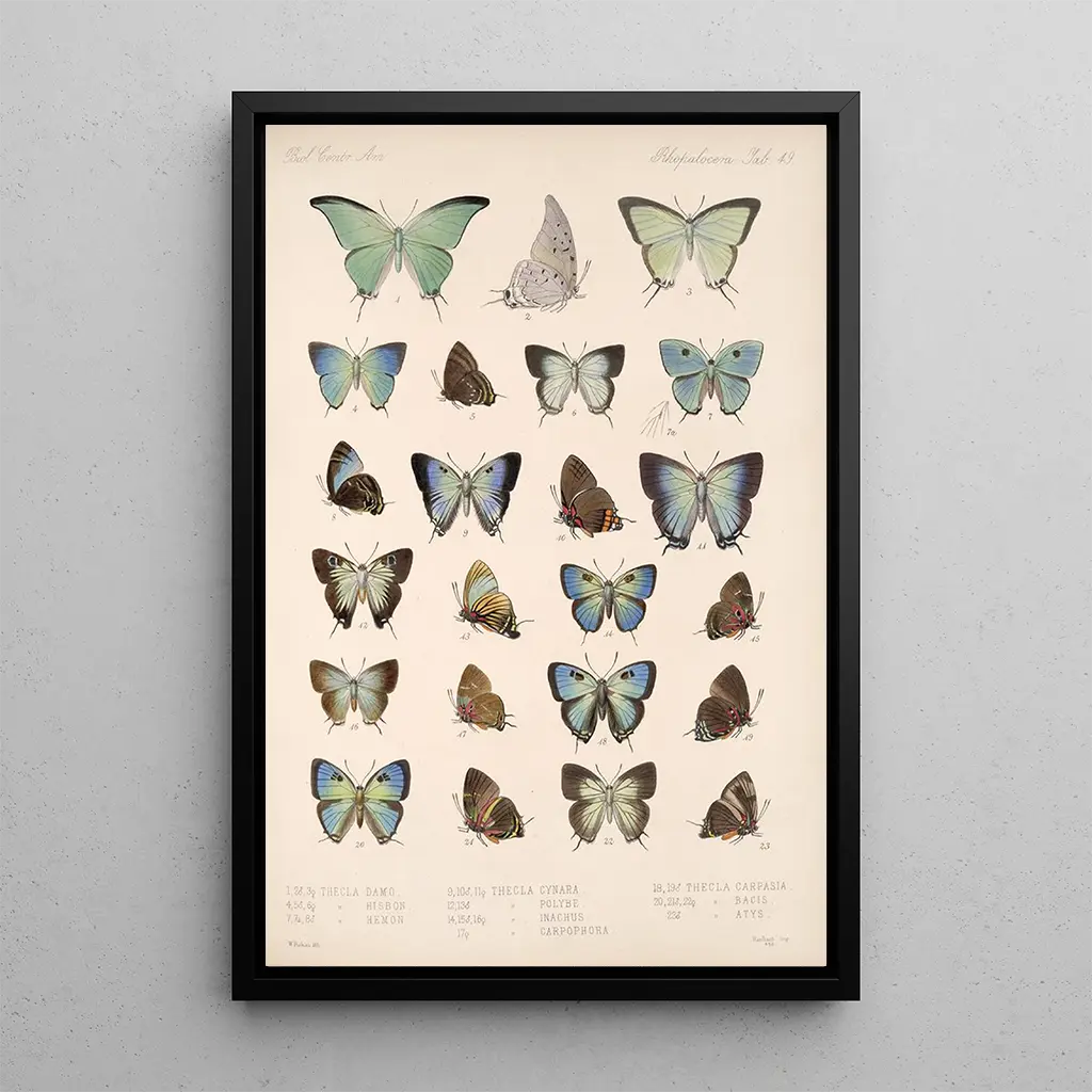 "Insecta Lepidoptera Rhopalocera Pl 050" værket af Frederick DuCane Godman tager os med ind i en fascinerende verden, hvor naturen udtrykker sig med ynde. Denne kunsttryk fremhæver en mangfoldighed af sommerfugle, hver illustreret med bemærkelsesværdig præcision. De livlige og varierede farver, fra strålende blå til lyse gule, skaber en glad og livlig atmosfære. Akvarelteknikken, anvendt med finesse, gør det muligt at fange letheden og den flygtige skønhed af disse insekter. Ved at betragte dette lærred føler man en invitation til at udforske den naturlige verden, og blive forundret over mangfoldigheden af arter.