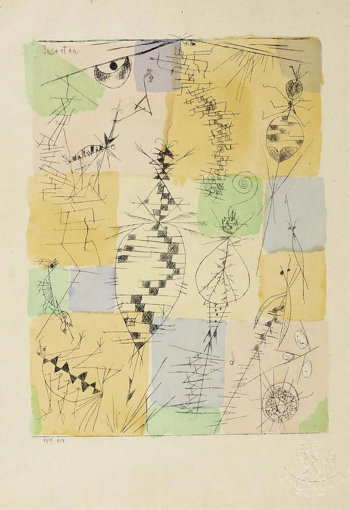 Paul Klee, født i 1879, er en af de mest indflydelsesrige kunstnere i det 20. århundrede, der dygtigt blander abstraktion og figurativ kunst. Hans kunstneriske rejse er præget af forskellige påvirkninger, fra kubisme til surrealismen, hvilket giver ham mulighed for at udvikle en unik og genkendelig stil. "Insekter" er en del af en periode, hvor Klee udforsker de organiske former og motiver fra naturen, mens han leger med farve og komposition. Hans tid på Bauhaus har også styrket hans engagement i kunstnerisk eksperimentering, hvilket gør ham til en central aktør i udviklingen af den moderne kunst.