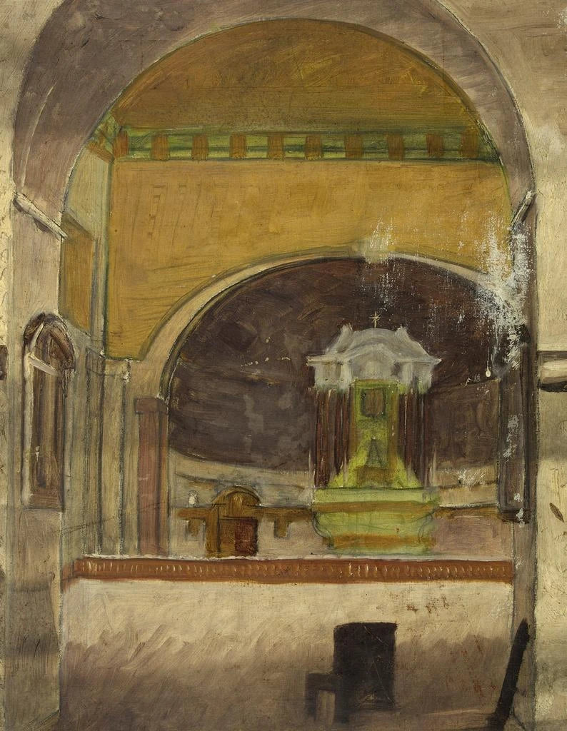 Arthur Joseph Gueniots værk skiller sig ud med en realistisk tilgang og en omhyggelig opmærksomhed på detaljer. Hvert penselstrøg synes at være fyldt med en intention, et ønske om at fange ikke kun kirkens udseende, men også dens sjæl. Farvetonerne valgt af kunstneren, fra varme nuancer til dybere skygger, skaber en atmosfære, der både er beroligende og mystisk. Kompositionen er omhyggeligt orkestreret, hvert element har sin plads, hvilket bidrager til den overordnede balance i scenen. Gueniot formår at etablere en dialog mellem arkitektur og lys, og forvandler rummet til en visuel, immersiv oplevelse. Denne evne til at fusionere det hellige og det daglige i en harmonisk visuel helhed er det, der gør dette værk så unikt og tidløst.