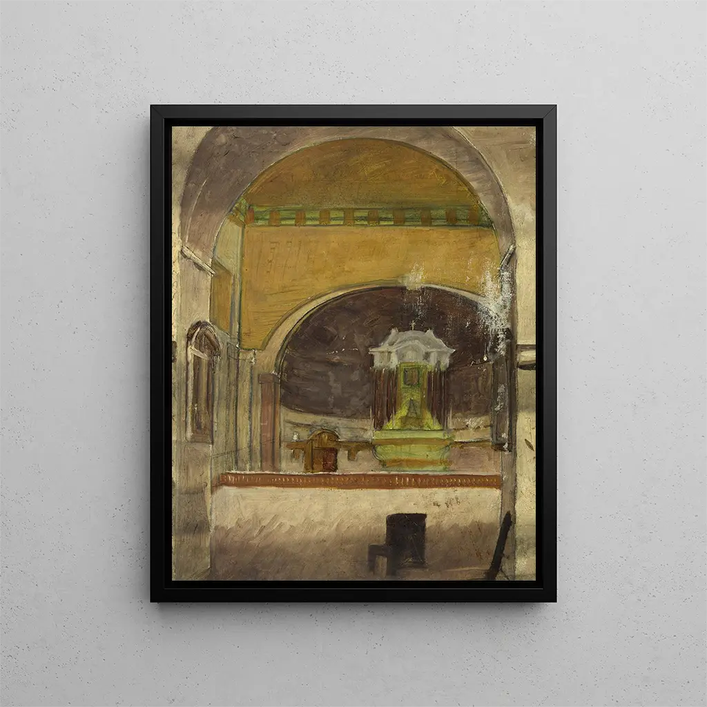 I det store panorama af kunsthistorien skiller visse værker sig ud ved deres evne til at fange essensen af et sted, en atmosfære, en følelse. "Indre af kirken Assisi - Arthur Joseph Gueniot" er et af disse værker, der transporterer betragteren til hjertet af et helligt sted præget af ro og spiritualitet. Det bløde lys, der filtrerer gennem glasmalerierne, de fine linjer i hvælvingerne, og den harmoniske placering af de arkitektoniske elementer inviterer til en introspektiv eftertanke. Dette maleri, en sand ode til skønheden i hellige rum, fremkalder en søgen efter indre fred, hylder de middelalderlige kirkers majestæt og indskriver sig i en stil, der er helt sin egen.