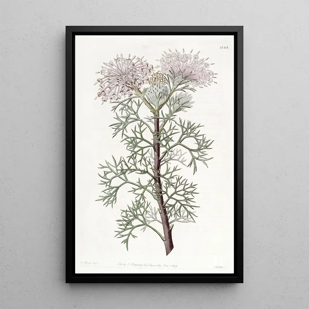 L'œuvre "Isopogon elegant" af Sydenham Edwards er en fascinerende repræsentation af denne unikke plante, der stammer fra Australien. De livlige farver og de geometriske former på blomsterne fanger øjet og fremkalder en følelse af eksotisme og friskhed. Graveringsteknikken, mestret af Edwards, gør det muligt præcist at gengive detaljerne i denne art, samtidig med at den skaber en lys og glædelig atmosfære. Hvert petal synes at danse under lyset, hvilket inviterer betragteren til at værdsætte den australske biodiversitets rigdom.