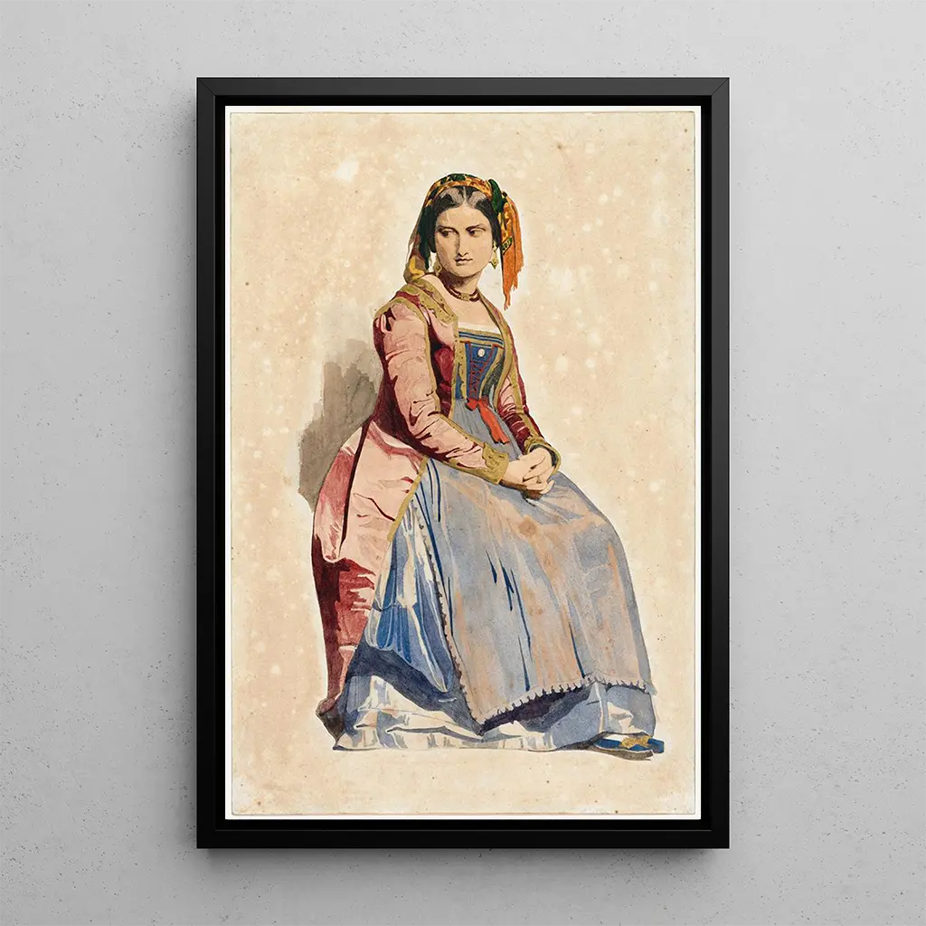 Den "Femme italienne assise" af Dominique Louis Papety er et kunsttryk, der fremkalder ynde og ro. Med bløde farver og en harmonisk komposition skildrer dette lærred en kvinde i en kontemplativ positur, indhyllet i en atmosfære af stilhed. Detaljerne i tøjet og ansigtstrækkene er gengivet med bemærkelsesværdig præcision, hvilket vidner om Papytes talent for at fange den kvindelige skønhed. Den subtile belysning fremhæver de delikate kurver i silhuetten, hvilket skaber et billede, der er både realistisk og poetisk.