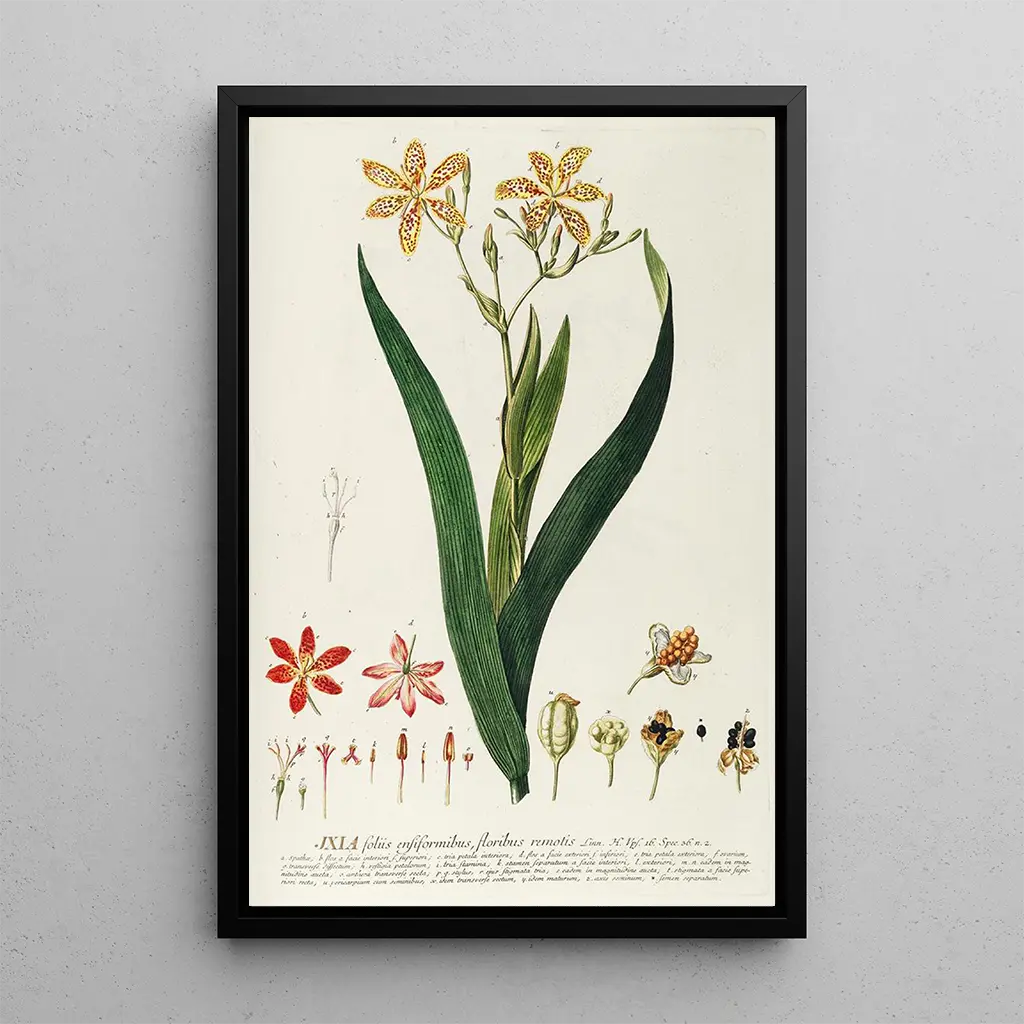 Kunsttrykket af Ixia er et klogt dekorativt valg til at berige dit hjem. Uanset om det er i stuen, på kontoret eller i soveværelset, vil dette lærred tilføre farve og liv til dit rum. Dets trykkvalitet sikrer en trofast gengivelse af de originale detaljer, hvilket gør dette værk til et ægte æstetisk aktiv. Ved at vælge dette kunsttryk vælger du ikke blot en dekorativ genstand, men også et stykke, der fremhæver naturens skønhed og den botaniske illustrators kunst, hvilket skaber en varm og indbydende atmosfære i dit hjem.