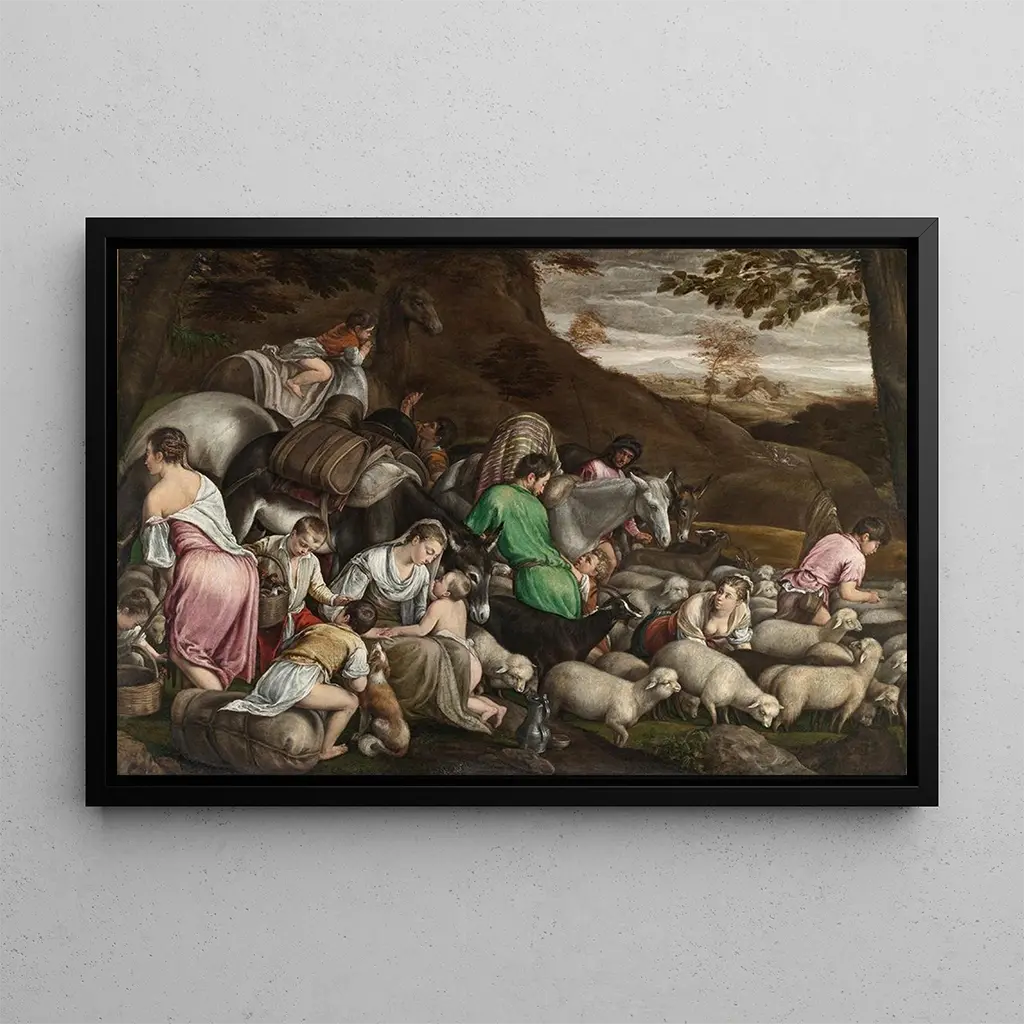 Jacopo Bassano, peintre italien du XVIe siècle, est reconnu pour son style unique qui allie influences vénitiennes et éléments narratifs. Sa carrière est marquée par une exploration des thèmes religieux et mythologiques, souvent enrichis de détails réalistes. Bassano a su s'imposer dans le milieu artistique de la Renaissance, et son œuvre "Le Voyage de Jacob" est emblématique de son talent à capturer des moments de tension et de beauté. Son approche innovante et sa maîtrise des couleurs font de lui une figure incontournable de l'histoire de l'art, et cette reproduction témoigne de son héritage artistique.