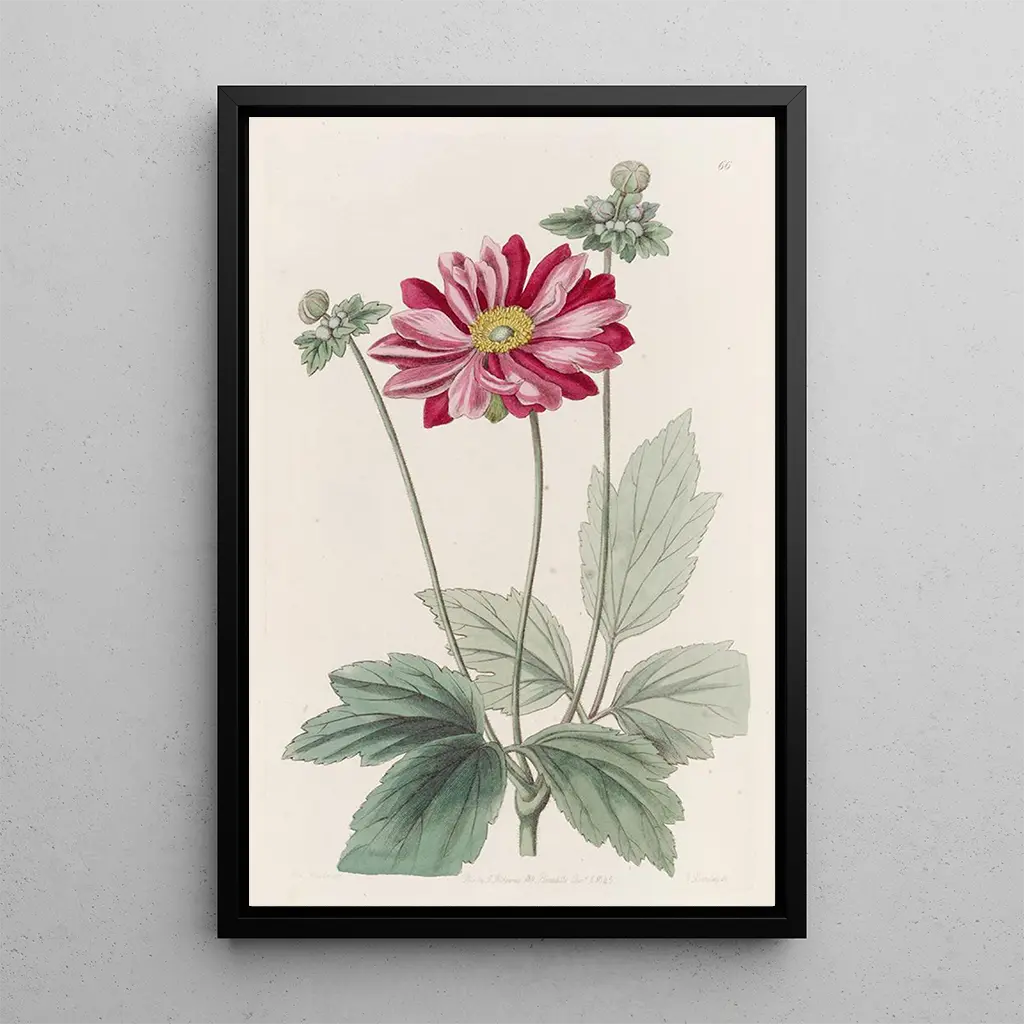 L'Anemone fra Japan, med sine fine kronblade og pastelfarver, fremkalder en yndefuld dans med vinden. Dette kunsttryk af Sydenham Edwards fanger naturens flygtige skønhed gennem en harmonisk komposition. Nuancerne af rosa og hvid blandes subtilt, mens den bløde baggrund fremhæver detaljernes finesse. Akvarelteknikken giver en lethed til hele værket, hvilket skaber en rolig og kontemplativ atmosfære. Hver blomst synes at vibrere af liv, og inviterer betragteren til at dykke ned i en fortryllende blomsterverden.