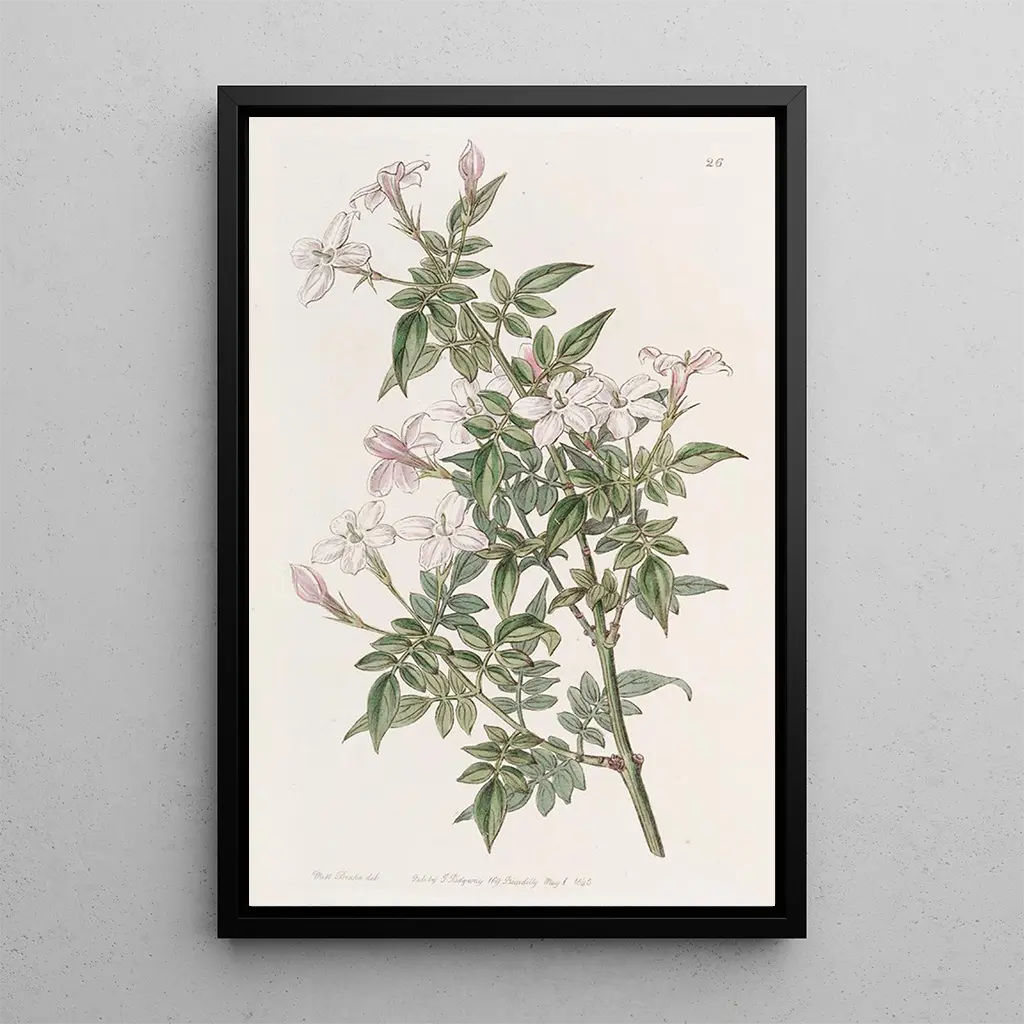 Det kunsttryk "Jasmin beslægtet" af Sydenham Edwards fremkalder en blomstrende flora-verden, hvor nuancer af grøn og hvid smelter harmonisk sammen. Den delikate komposition af dette kunsttryk fremhæver den flygtige skønhed af blomsterne, og fanger lyset på en måde, der næsten virker levende. De omhyggelige detaljer i kronblade og blade vidner om en omhyggelig teknik, der afslører kunstnerens passion for botanik. Atmosfæren, der udspringer af dette kunsttryk, inviterer til en beroligende eftertanke, hvor hvert element synes at fortælle en historie om natur og ro.