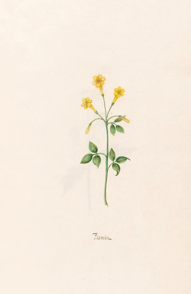 Den kunsttryk Jasmin af Magdalena Rosina Funck tager os med ind i en blomsterverden præget af blidhed. Pastelfarver, domineret af nuancer af hvid og grøn, skaber en beroligende, næsten drømmende atmosfære. Akvarelteknikken, med sine lette og flydende penselstrøg, giver liv til hver enkelt blomst, hvert blad, som om jasminen er ved at blomstre foran vores øjne. Værket inviterer til en rolig eftertanke, hvor naturens flygtige skønhed fremhæves, og magien i de ofte oversete detaljer afsløres.