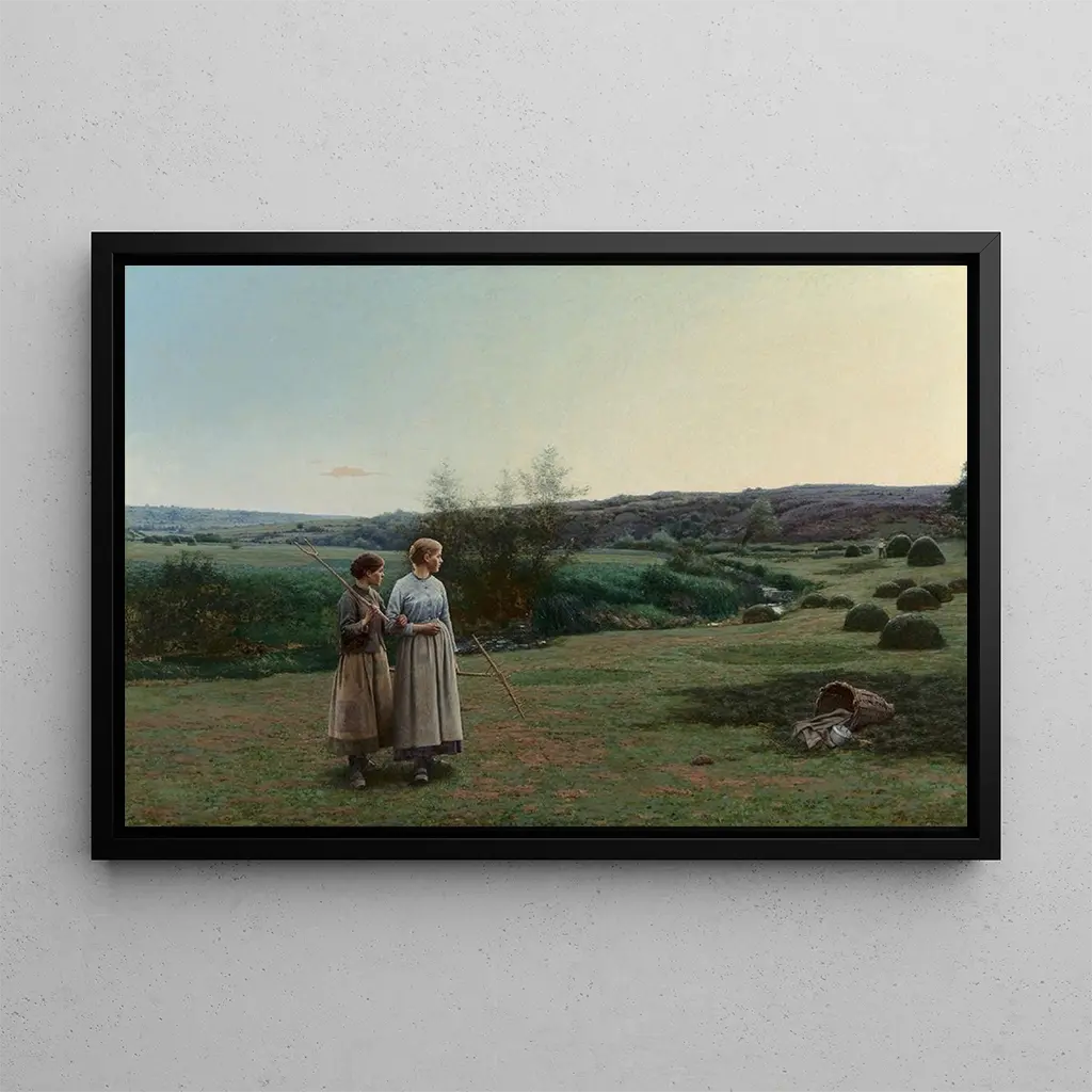 I værket "Les r rake" dykker Jean Ferdinand Monchablon ned i en idyllisk scene, hvor naturen og mennesket sameksisterer harmonisk. Kompositionen domineres af varme nuancer, der fremkalder det gyldne lys fra solnedgangen, som bader landskabet. R rake, symboler på landbrugsarbejde, er omhyggeligt placeret, hvilket skaber en visuel dynamik, der fanger blikket. Monchablons teknik, der blander impressionisme og realisme, giver dette lærred en fredelig og kontemplativ atmosfære, der inviterer betragteren til at føle roen i et øjeblik frosset i tiden.