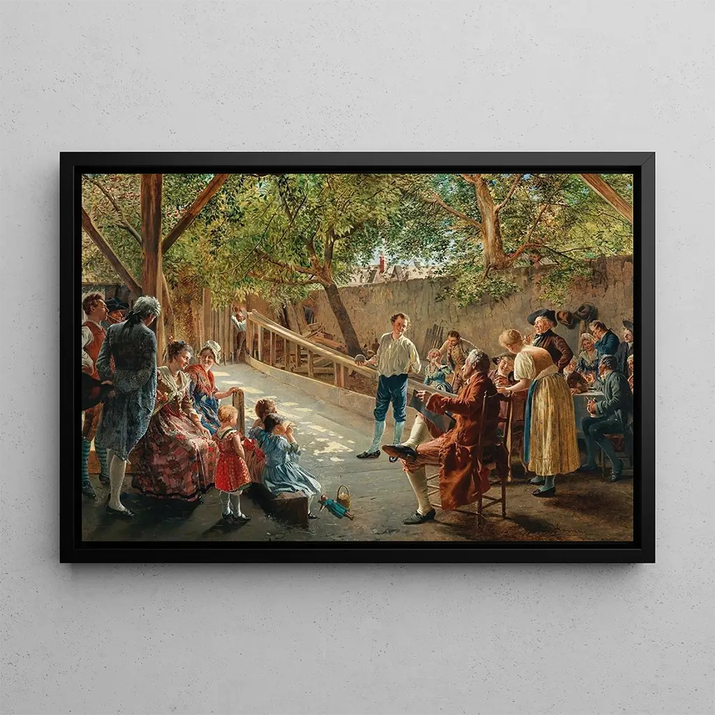 La Salle de quilles af Johann Hamza tager os med ind i en livlig og energisk scene, hvor man kan mærke begejstringen af et delt fritidsøjeblik. De varme og lyse farver, kombineret med en delikat maleteknik, giver liv til figurerne, der beskæftiger sig med keglerne. De glade udtryk og de dynamiske gestus fra spillerne skaber en festlig og kammeratlig atmosfære. Hvert detalje, fra tøjet til tilbehøret, vidner om en omhyggelig opmærksomhed, hvilket gør dette kunsttryk fængslende og fordybende.