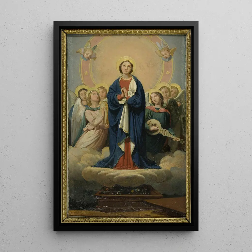 L'Assomption de la Vierge, etnisk ikonisk kunstværk af Jean-Louis Bézard, inviterer til dyb refleksion. Lærredet viser en palette af livlige farver, hvor himmelske blå nuancer smelter sammen med strålende guld, hvilket symboliserer transcendens. Den dynamiske komposition, centreret omkring Vierge, skaber en atmosfære af ro og majestæt. De engleagtige figurer, omhyggeligt malet, synes at svæve omkring hende, hvilket styrker ideen om en guddommelig opstigning. Hvert penselstrøg afslører kunstnerens tekniske dygtighed, der formår at fange essensen af denne hellige begivenhed.