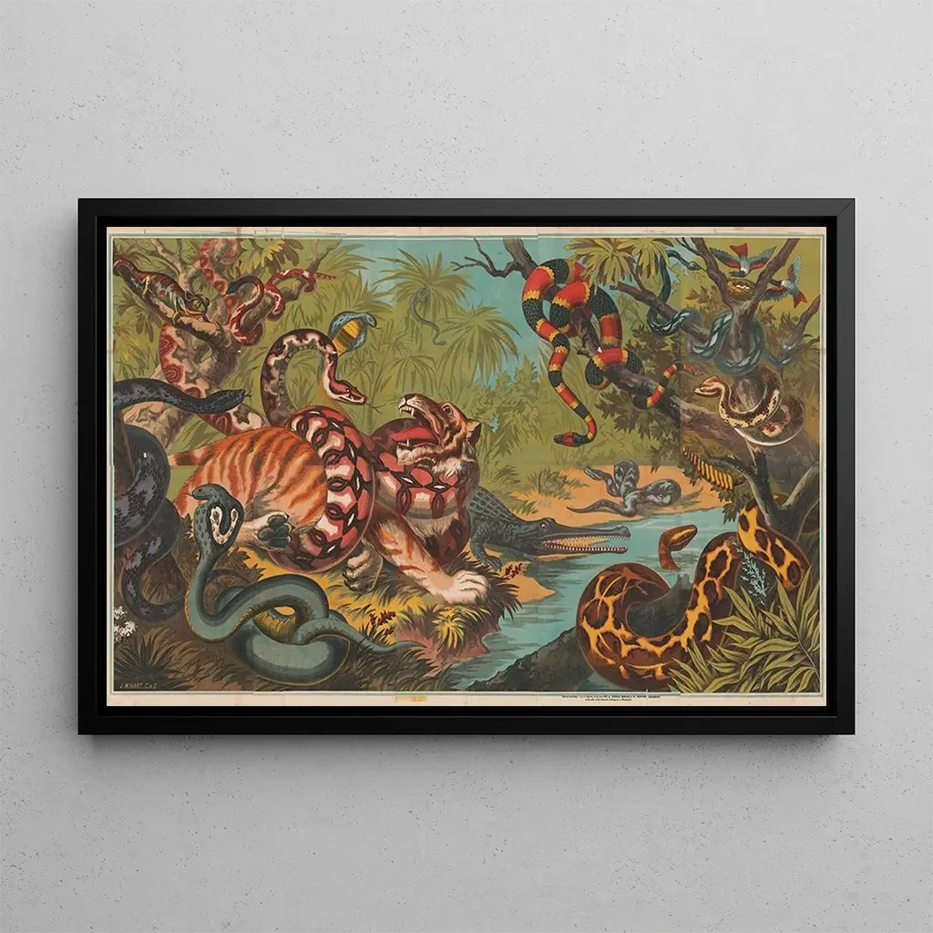 I dette slående kunsttryk fanger JW Hart et dramatisk øjeblik fra naturen, hvor en slange er ved at kvæle sit bytte. De livlige farver i junglen, med nuancer af frodigt grønt og brun jord, skaber en slående kontrast til den spændingsfyldte scene, der udfolder sig. Harts teknik, der kombinerer realisme og ekspressionisme, gør det muligt at mærke intensiteten i denne kamp for overlevelse. Hvert detalje, fra den snoede slange til dyrets træk, er gengivet med en præcision, der transporterer betragteren til hjertet af denne vilde og fængslende scene.