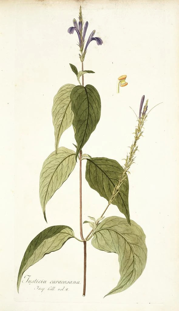 Nikolaus Joseph Freiherr von Jacquin, botaniker og kunstner fra det 18. århundrede, markerede sin tid med sine præcise og poetiske botaniske illustrationer. Hans rejser til Sydamerika gav ham mulighed for at opdage en mangfoldighed af planter, herunder Justicia caracasana. Påvirket af datidens videnskabelige strømninger formåede Jacquin at forene kunst og videnskab, hvilket bidrog til fremskridt inden for botanisk viden. Hans værk er et vidnesbyrd om forundring over naturen og vigtigheden af dens bevarelse, hvilket gør ham til en ikonisk figur inden for botanisk illustration.