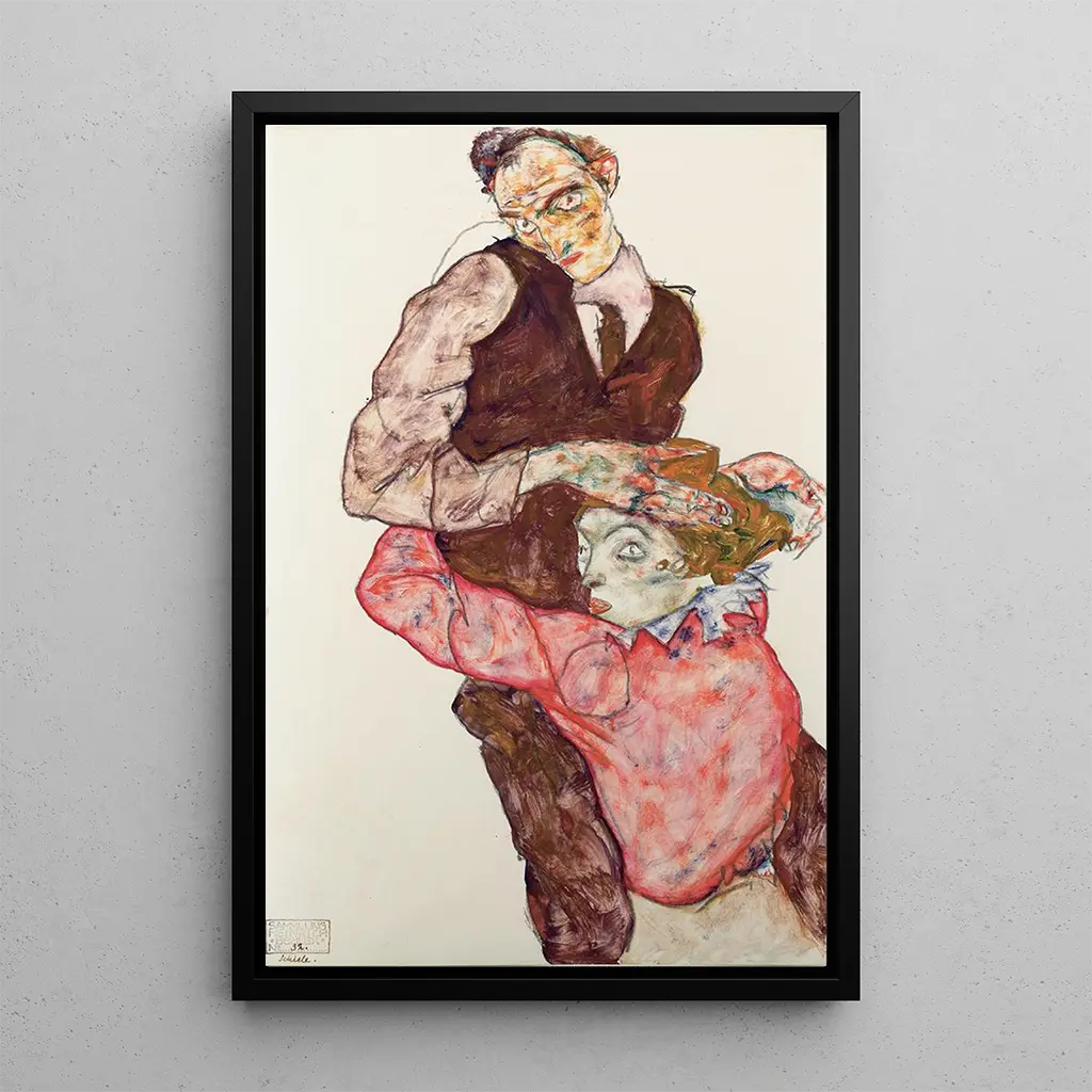 I "Amoureux" fanger Egon Schiele den intense følelse af menneskelige emotioner gennem en dristig komposition og livlige farver. Figurerne, ofte forvrængede, er indhyllet i en atmosfære, der er både intim og foruroligende. De udtryksfulde træk og de flydende linjer vidner om Schieles mestring inden for kunstnerisk repræsentation af den menneskelige krop. Lærredet fremkalder en mærkbar spænding mellem kærlighed og lidelse, hvilket gør seeren til vidne til en kompleks følelsesmæssig dans. Anvendelsen af varme nuancer og markante kontraster forstærker scenens intensitet og inviterer til en dyb refleksion over menneskelige relationer.