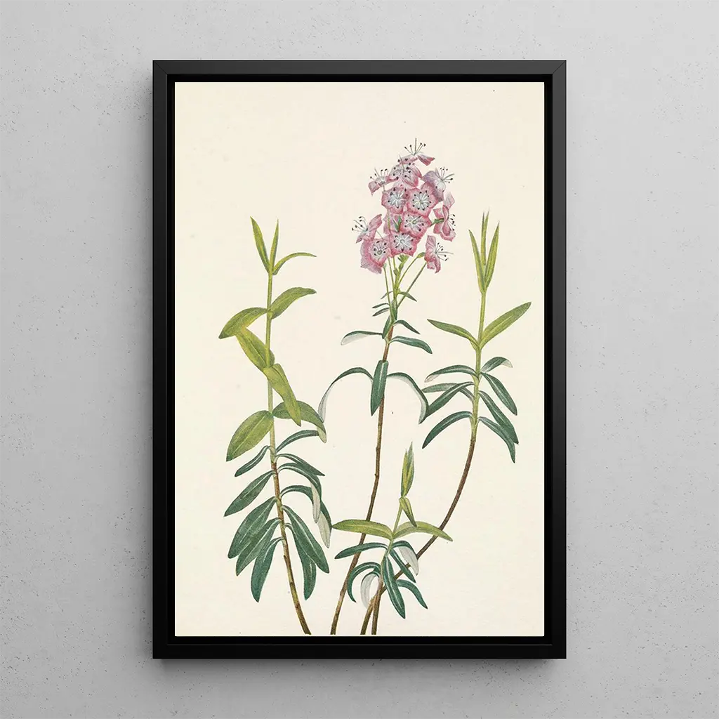 Kunsttrykket af Kalmia des marais, eller Kalmia polifolia, tager os med ind i en delikat blomsterverden. Med sine pastelfarver, der spænder fra blid rosa til strålende hvid, fremkalder dette værk blidheden i de fugtige enge. De omhyggelige detaljer i blomsterbladene, gengivet med akvarelmaleteknik, skaber en atmosfære af ro. Hvert penselstrøg synes at fange lyset, der danser over blomsterne, og inviterer til fredelig eftertanke. Dette lærred, både realistisk og poetisk, minder os om naturens skrøbelige skønhed.