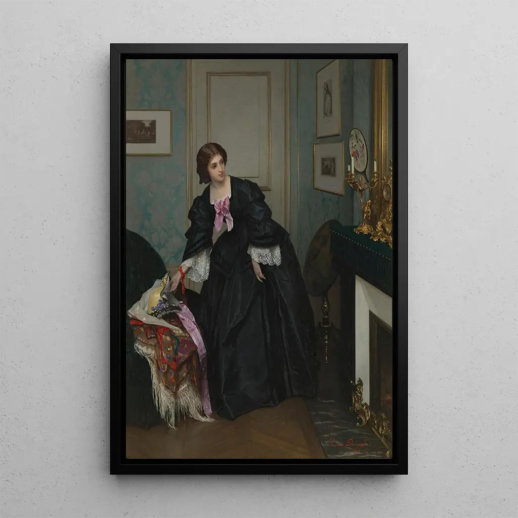 I denne kunsttryk af Se på klokken fremkalder Gustave Léonard de Jonghe en atmosfære præget af blidhed og melankoli. Kompositionen fremhæver en kontemplativ kvinde, dybt fortabt i sine tanker, mens et dæmpet lys bader scenen. Pastelfarver og raffinerede detaljer skaber en intim stemning, næsten drømmende. Jonghes teknik, der kombinerer realisme og følsomhed, gør det muligt at mærke den følelse, der udspringer af dette kunsttryk, og inviterer betragteren til at dele et refleksionsøjeblik.