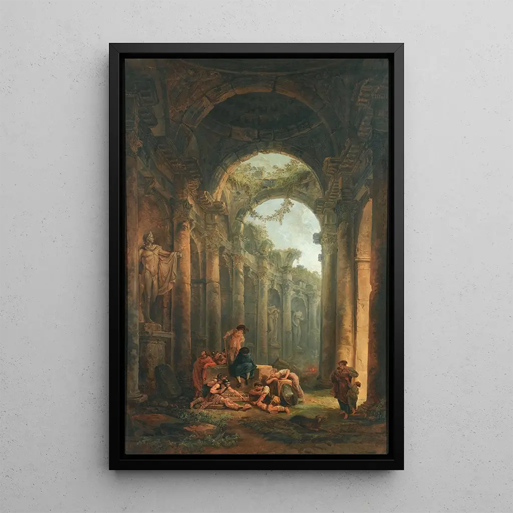 Ruiner klassisk med soldater, der leger: et ekko fra fortiden Dette fascinerende kunsttryk af Hubert Robert, "Ruiner klassisk med soldater, der leger", transporterer os til en verden, hvor historie og leg mødes. De majestætiske ruiner, rester af en svunden æra, fungerer som baggrund for en livlig scene, hvor soldater, i fuld aktivitet, deltager i børnelege. Det bløde lys, der bader scenen, samt de varme farver, skaber en atmosfære, der både er nostalgisk og glædelig. Kompositionen, balanceret og dynamisk, inviterer betragteren til at udforske de arkitektoniske detaljer, mens fokus er på karakterernes interaktion, hvilket afslører en legende side af historien. Hubert Robert: drømmerens og minderne kunstner Hubert Robert, en ikonisk figur fra det 18. århundrede, er kendt for sin evne til at fusionere det virkelige og det imaginære. Uddannet ved den kongelige maler- og skulpturskole, henter han inspiration fra de store italienske mestre for at udvikle sin egen stil. Hans kunstværker, ofte fyldt med ruiner og idealiserede landskaber, afspejler en stærk interesse for antikken og naturen. Som hofmaler formåede han at fange sin tids ånd, og kombinerede dygtigt landskabernes skønhed med scener fra dagligdagen. Hans kunstneriske arv består, hvilket vidner om betydningen af fantasi i kunsten. En dekorativ erhvervelse med mange fordele Kunsttrykket af "Ruiner klassisk med soldater, der leger" er et perfekt valg til at berige din indretning. Uanset om det er i stuen, på kontoret eller i soveværelset, vil dette lærred tilføre elegance og historie til dit rum. Dets trykkvalitet og trofasthed mod det originale værk sikrer en slående visuel gengivelse. Ved at integrere dette billede i din indretning giver du dit miljø en kunstnerisk dimension, der både fremkalder skønheden i antikke ruiner og legens lethed, hvilket skaber en harmonisk og inspirerende atmosfære.